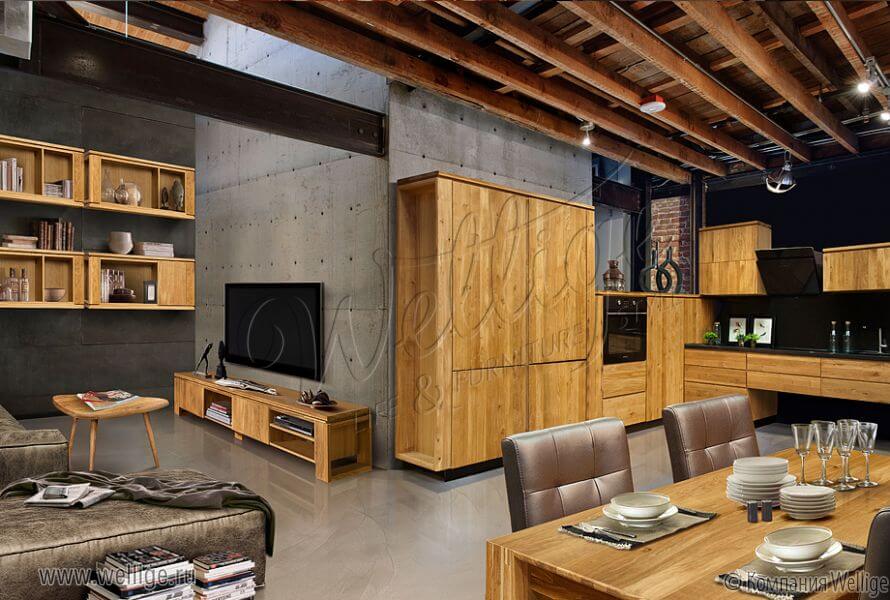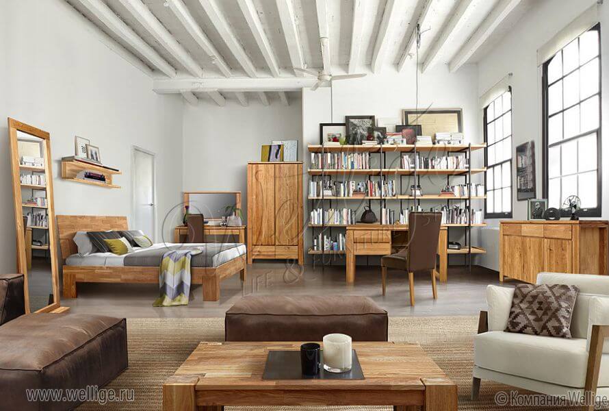 Корпусная мебель в лофт-интерьере используется чаще всего, так как данный стиль предполагает расположение мебели на некотором расстоянии от стены. Она универсальна, практична, ее можно поставить в любом подходящем по параметрам месте. Чаще всего используются столы, комоды, стулья и этажерки, которые обязательно должны быть изготовлены из натуральной древесины.