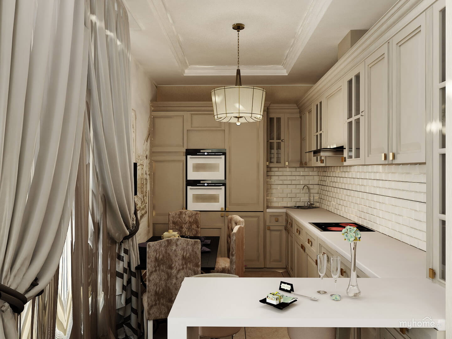 В классике идеально оформлять большие помещения с высокими потолками. Если вы располагаете небольшой кухней, интерьер в бело-бежевых тонах будет оптимальным вариантом. Например: светло-бежевая мебель и белые стены, фартук, шторы и основные аксессуары.