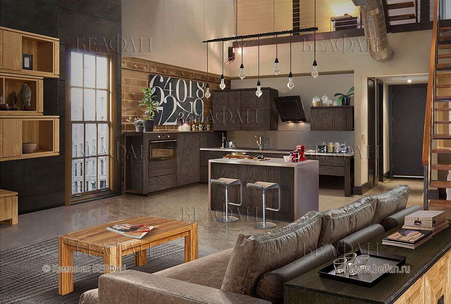 Для оформления интерьера кухни в бежевых тонах в большом доме можно использовать лофт. В обстановке должна читаться некая фабричность, заводской стиль. Воссоздать это можно при помощи кирпичных стен, островного гарнитура, выступающих труб, больших оконных проемов. Лучше всего для этого стиля подходят просторные помещения.