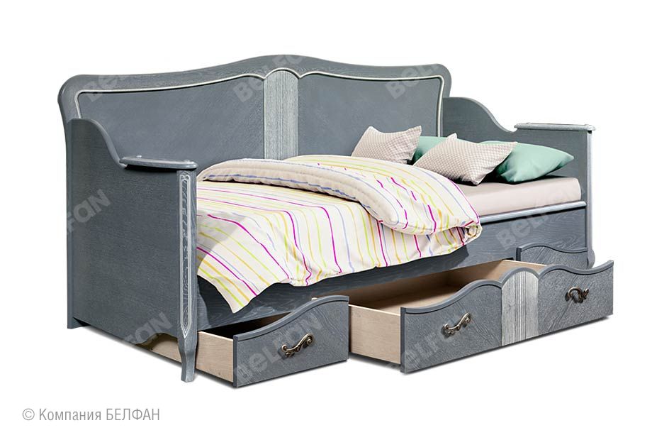 - Обычной односпальной моделью с изголовьем и (или) изножьем. Лучше, если кровать будет с ящиками для хранения (выдвижными и распашными). Чем выше этот предмет мебели, тем более вместительны ящики.