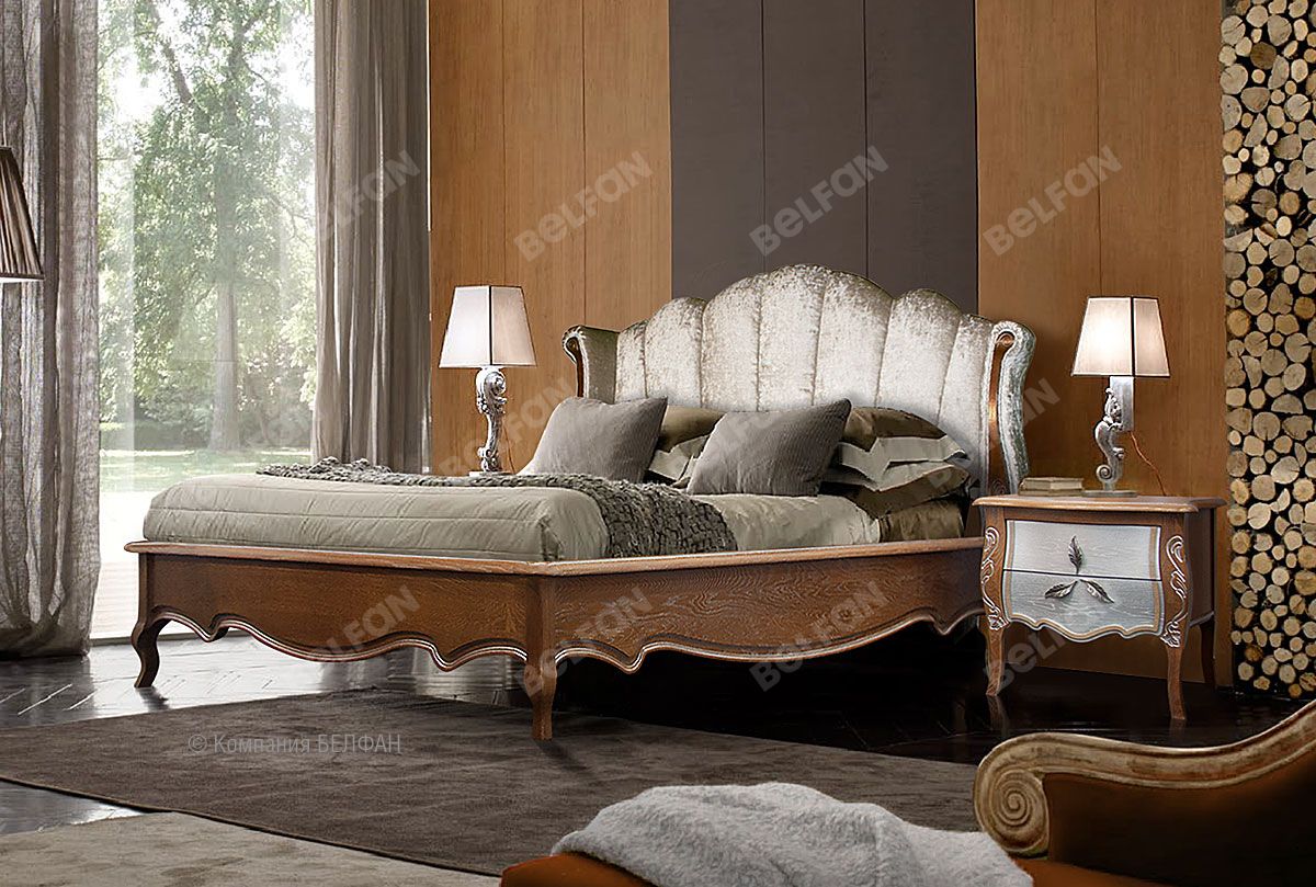 - С резными деревянными спинками, украшением которых служат позолота, декоративные накладки и инкрустация, дополняющими спальни в стилях барокко, рококо или классика.