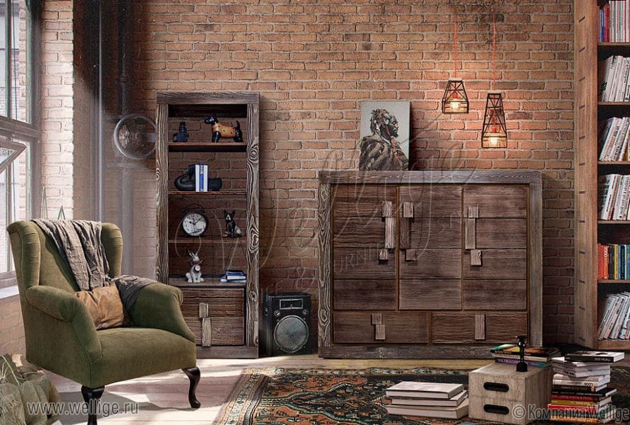 Ультрасовременная, многофункциональная, уникальная либо откровенно древняя, с явными потертостями и дефектами – именно такая мебель должна использоваться при оформлении интерьера. Она заметная, яркая, практичная и удобная – и в то же время гармонично дополняющая дизайнерскую идею. Из корпусной мебели популярны полки, книжные шкафы, стеллажи, которые могут выполнять роль декоративных перегородок, из мягкой – массивные диваны и незамысловатые кресла.