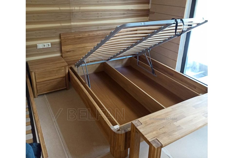 Угол открывания подъёмного механизма 36 градусов. Функционален, практичен и, с экономической стороны, полностью оправдывает вложения. Изготавливается в различных цветах. Размер ортопедической решетки по длине: 1950 мм, высота ящика – 230 мм. Ящик устанавливается на пол (дополнительно может крепиться к спинке и царгам кровати). Подъемный механизм данного бельевого ящика комплектуется двумя газлифтами, которые позволяют поднимать основание. Мощность одного подъемного механизма составляет 500 - 1150 Ньютонов (в зависимость от размера спального места), что соответствует весу в 51 - 104 кг. Ортопедическая решетка является разборной. При ежедневном использовании бельевого ящика с подъемным механизмом рекомендуем использовать простынь на резинке.