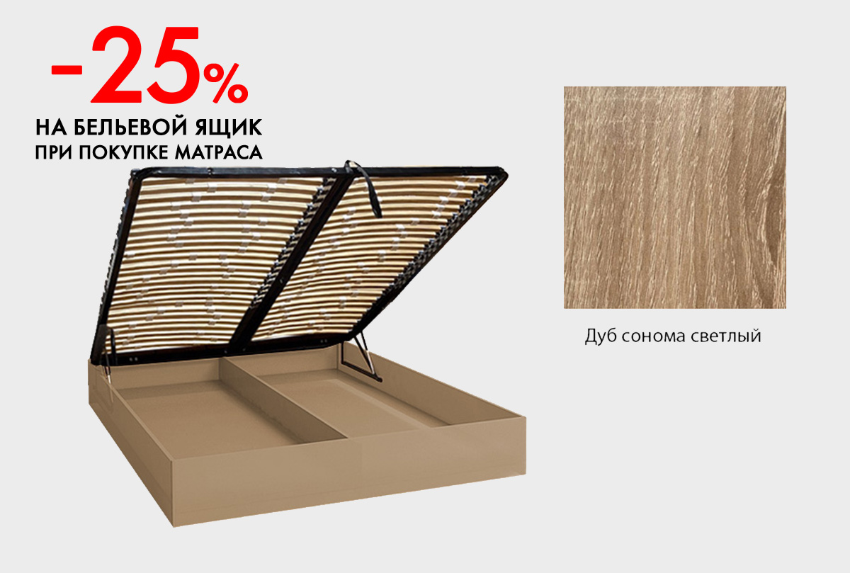 Угол открывания подъёмного механизма 36 градусов. Функционален, практичен и, с экономической стороны, полностью оправдывает вложения. Изготавливается в различных цветах. Размер ортопедической решетки по длине: 1950 мм, высота ящика – 230 мм. Ящик устанавливается на пол (дополнительно может крепиться к спинке и царгам кровати). При ежедневном использовании бельевого ящика с подъемным механизмом рекомендуем использовать простынь на резинке.