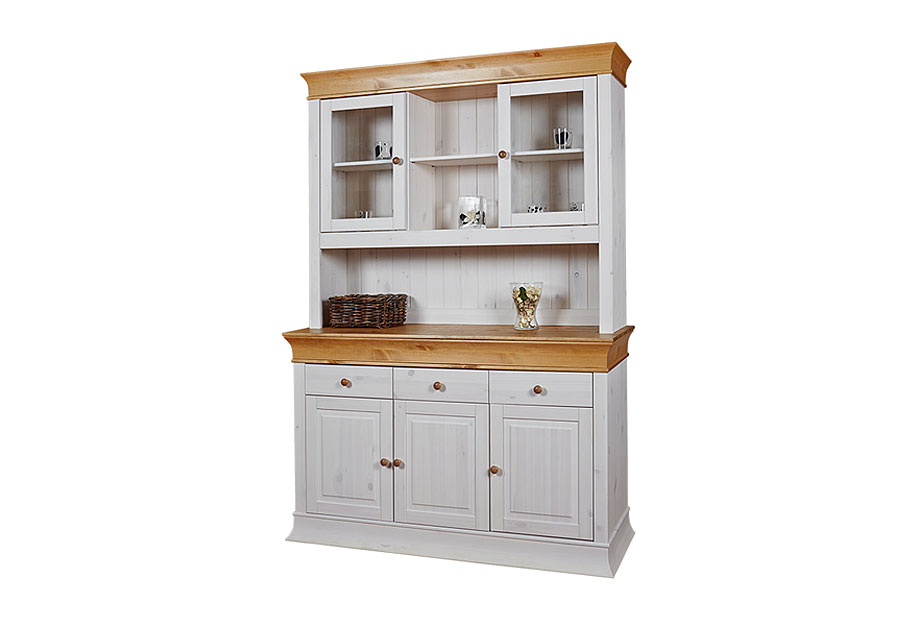 Привлекательный буфет «Бостон» из массива сосны для кухни или столовой. Две стеклянные двери с двумя отсеками по бокам и два открытых отсека обеспечивают пространство для блюд.
