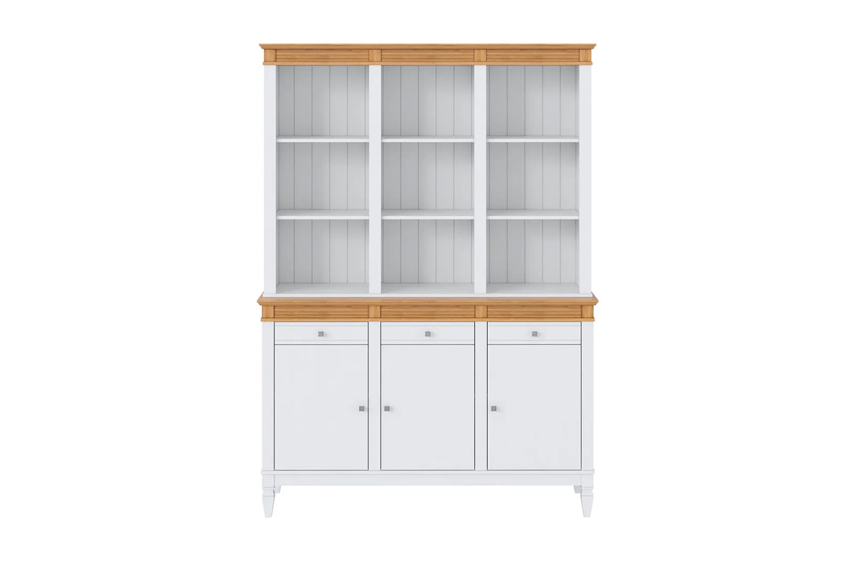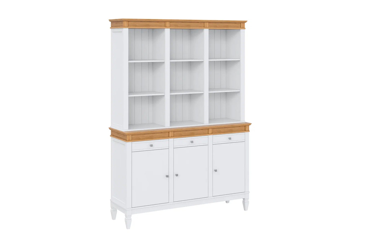 Буфет «Ольса» 300/333 выполнен из массива сосны. Удобный и вместительный, очень прост, но при этом функционален. Отлично впишется как в обеденную так и в гостиную. Буфет визуально разделен на 3 секции которые укомплектованы шестью полками сверху, тремя полками снизу за тремя распашными дверями и тремя ящиками.