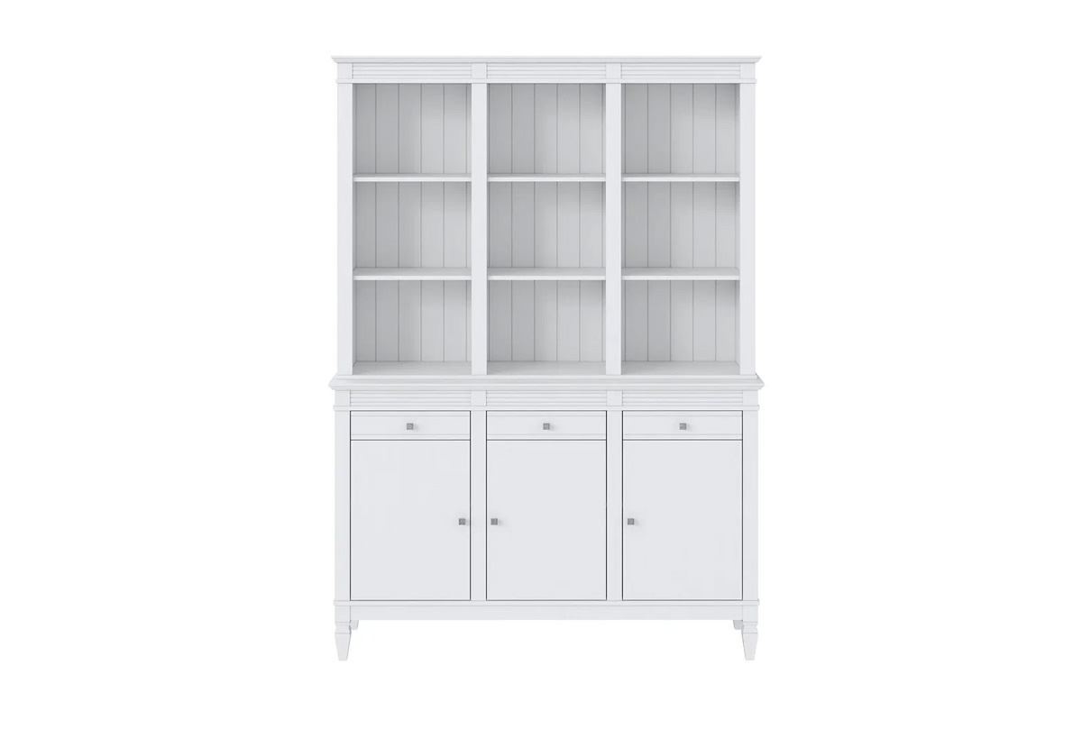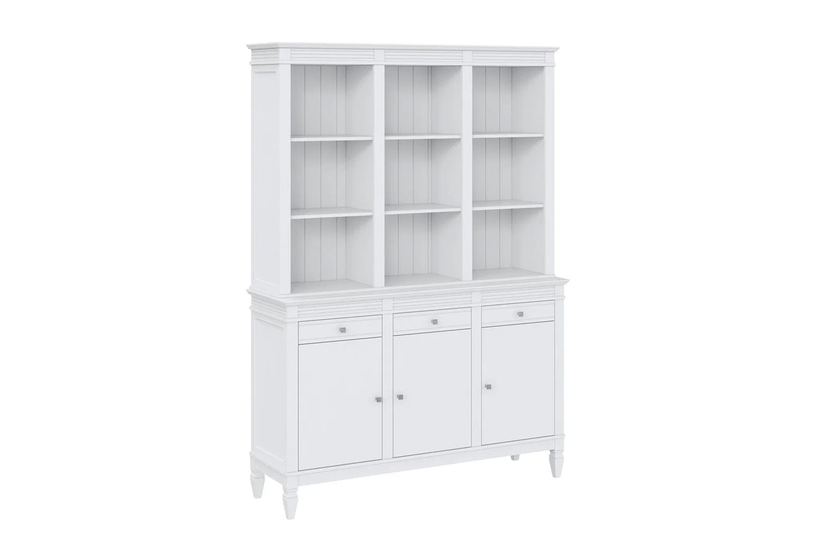 Буфет «Ольса» 300/333 выполнен из массива сосны. Удобный и вместительный, очень прост, но при этом функционален. Отлично впишется как в обеденную так и в гостиную. Буфет визуально разделен на 3 секции которые укомплектованы шестью полками сверху, тремя полками снизу за тремя распашными дверями и тремя ящиками.