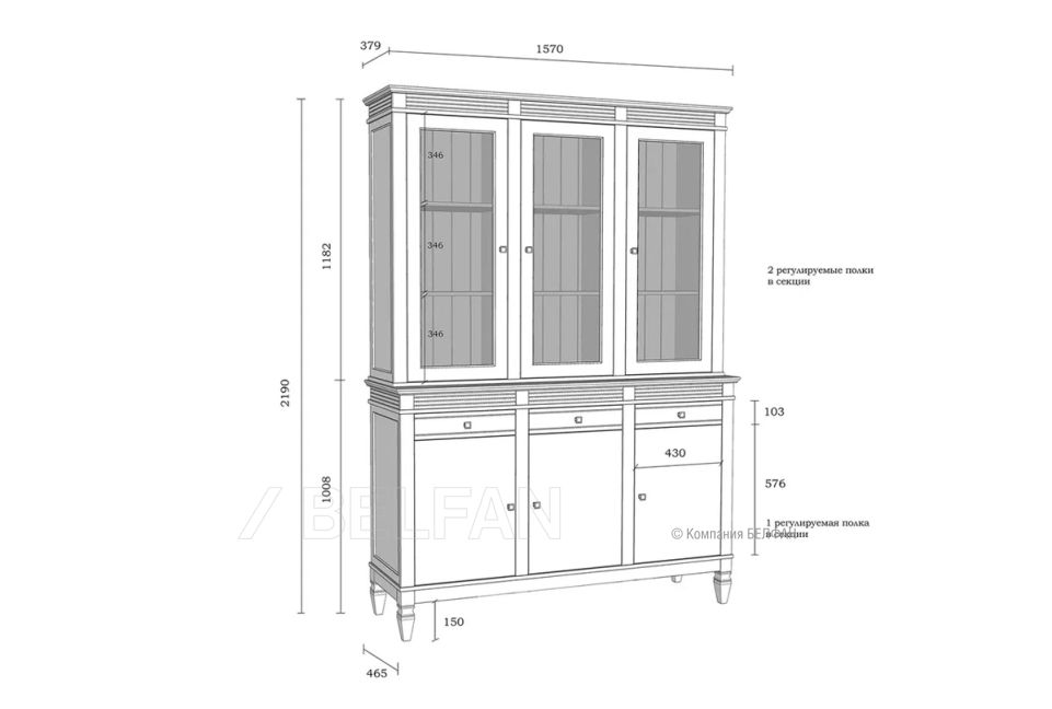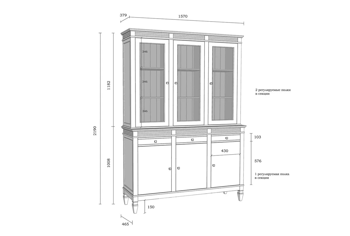 Буфет «Ольса» 330/333 выполнен из массива сосны. Удобный и вместительный, очень прост, но при этом функционален. Отлично впишется как в обеденную так и в гостиную. Буфет визуально разделен на 3 секции которые укомплектованы шестью полками сверху за тремя стеклянными дверями, тремя полками снизу за тремя распашными дверями и тремя ящиками.