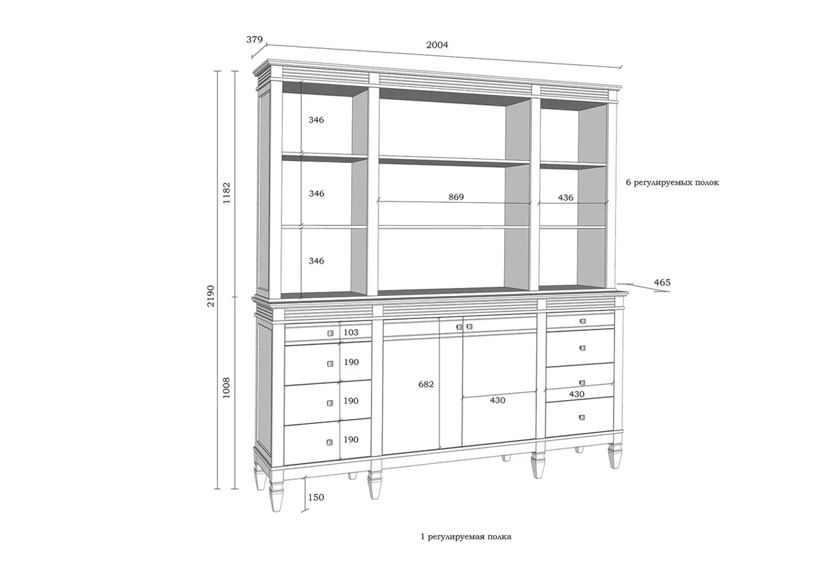 Буфет «Ольса» 400/428 из массива сосны. Удобный и вместительный, очень прост, но при этом функционален. Отлично впишется как в обеденную так и в гостиную. Буфет визуально разделен на 3 секции которые укомплектованы шестью полками сверху, одной широкой полкой снизу за двумя распашными дверями и восемь ящиков.