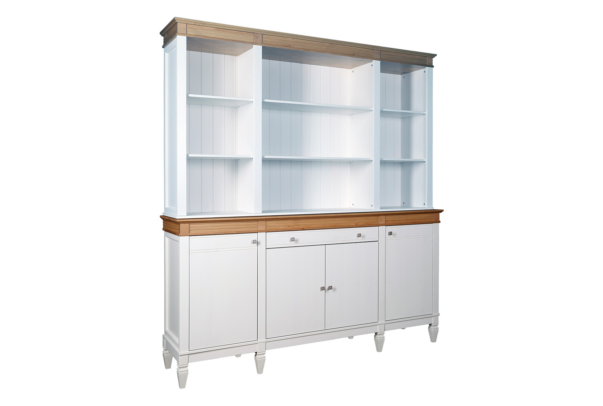 Буфет «Ольса» 400/441 выполнен из массива сосны. Отлично впишется как в обеденную так и в гостиную. Буфет укомплектован шестью полками сверху, тремя полками снизу за распашными дверями и одним ящиком.
