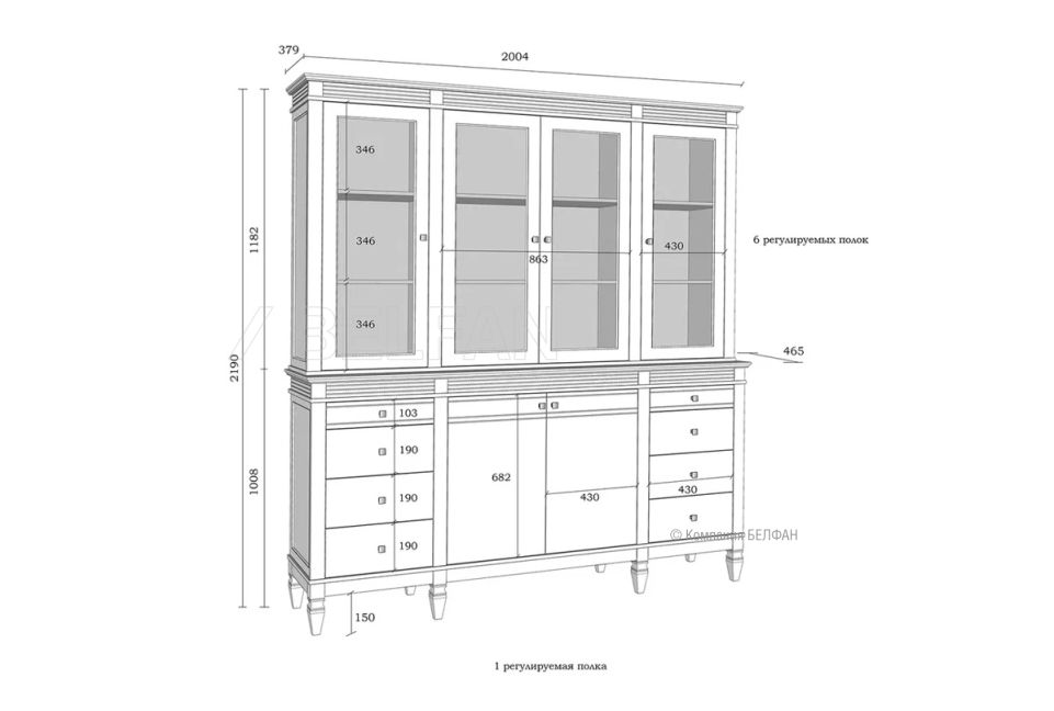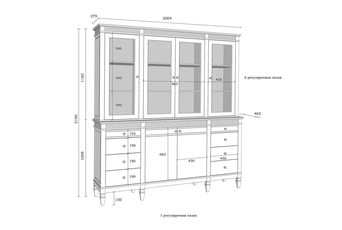 Буфет «Ольса» 440/428 выполнен из массива сосны. Удобный и вместительный, очень прост, но при этом функционален. Отлично впишется как в обеденную так и в гостиную. Буфет визуально разделен на 3 секции которые укомплектованы шестью полками сверху за четырьмя стеклянными распашными дверями, одной широкой полкой снизу за двумя распашными дверями и восемь ящиков.