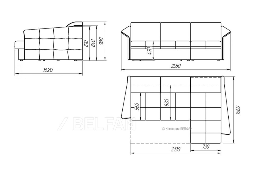 ✅ Высота посадочного места - 450 мм, глубина посадочного места - 560 мм, ширина посадочного места дивана - 2130 мм, ширина посадочного места оттоманки - 730 мм.