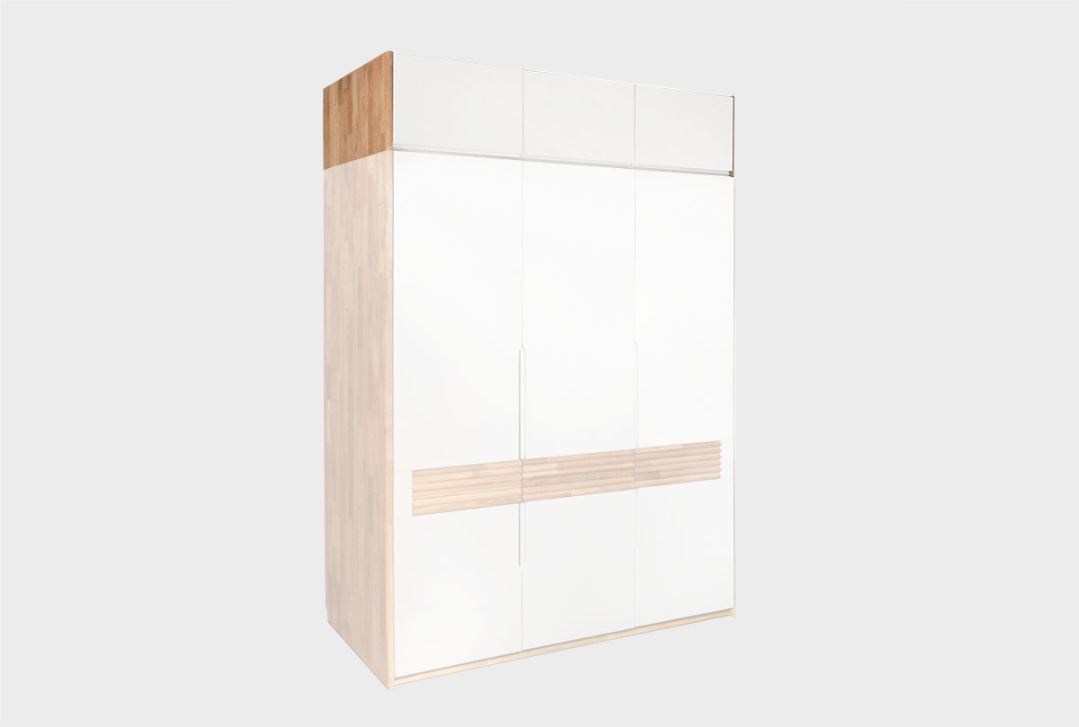Секция для трехдверного шкафа для одежды Wallstreet (Уоллстрит) в цвете «к-бейц-масло, ф-белый, вн-белый» с сочетанием текстуры натурального дерева и акцентных вставок. Сдержанно-светлая цветовая гамма, фасады в цвете на выбор. Дополнительная секция (антресоль) отлично подходит для сезонных вещей, постельного белья или других предметов, для которых никогда не хватает места в обычном шкафу. Высокий шкаф в потолок – это разумное и функциональное использование пространства!