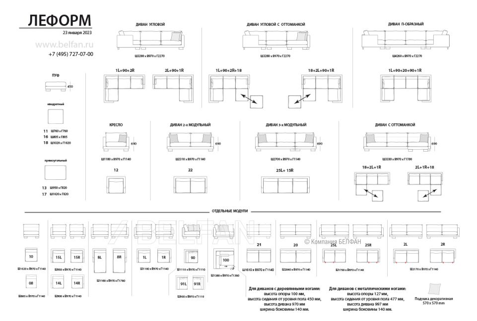 ✅ Для модулей с деревянными опорами: Высота опоры – 100 мм. Высота посадочного места – 450 мм. Высота дивана – 970 мм.