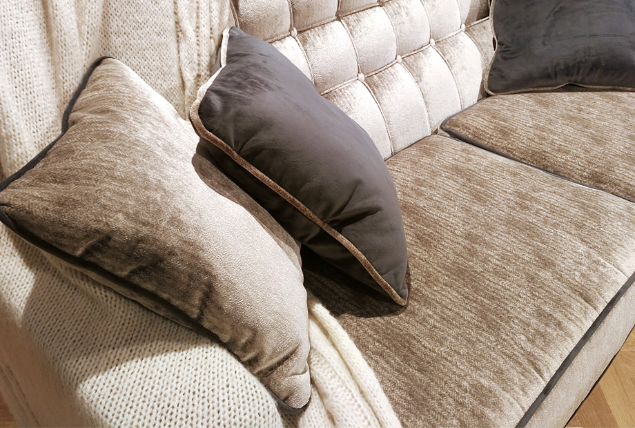 ✅ Диван украшен кантом по контуру сиденья, боковин, декоративных подушек.