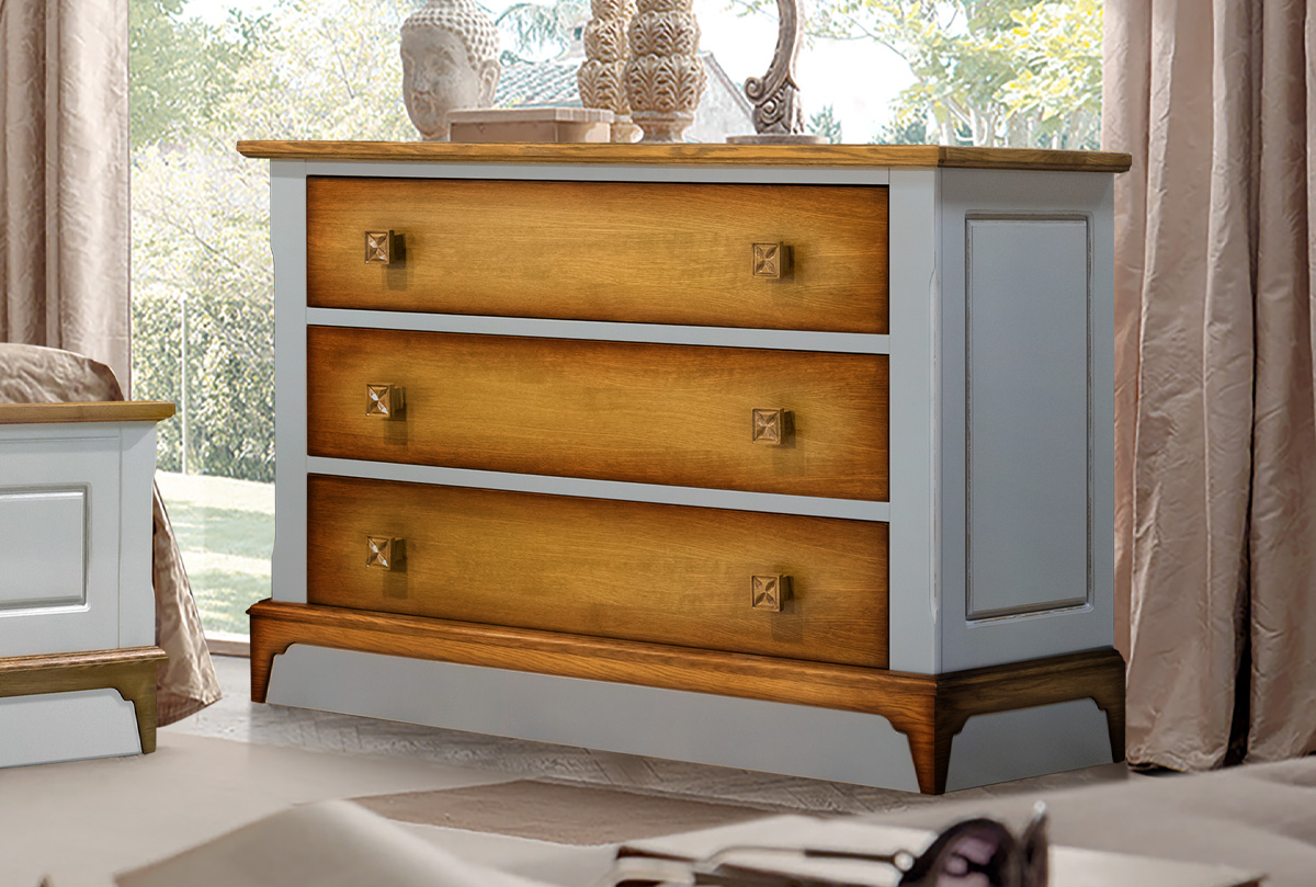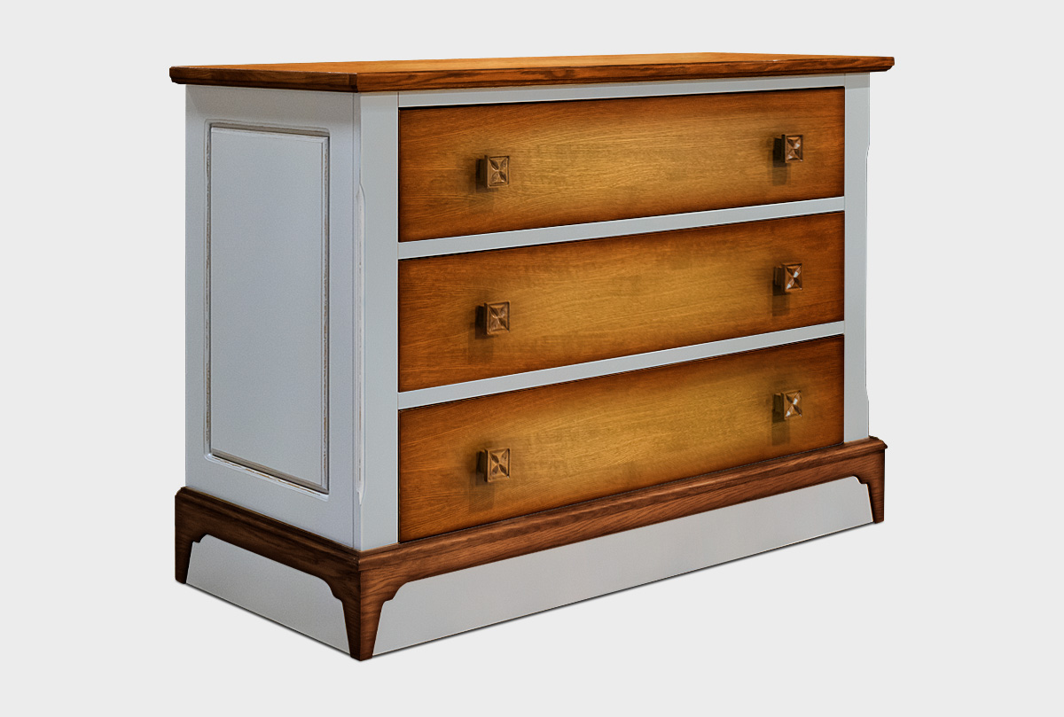 Комод из коллекции Brianson в цвете "муссон+дуб" прекрасен в своей незамысловатости. Простые формы и четкие линии лишь слегка разбавлены декоративными элементами. Три выдвижных ящика с направляющими полного выдвижения позволяют выдвигать ящики полностью и задействовать для хранения вещей всю их площадь.