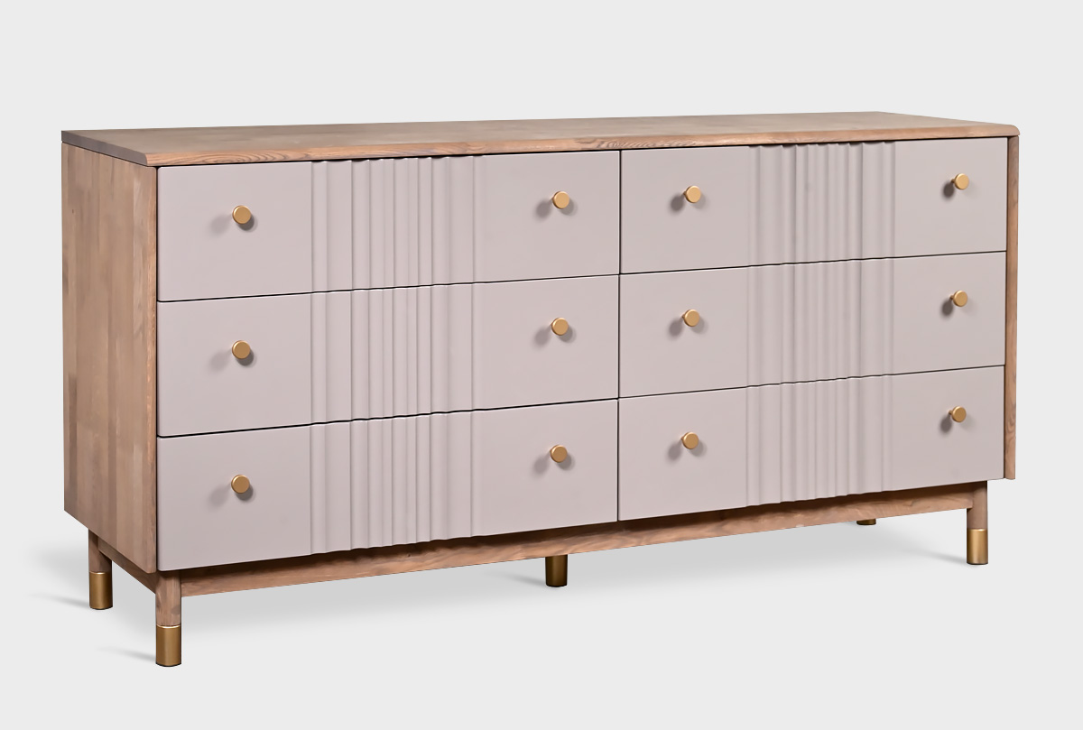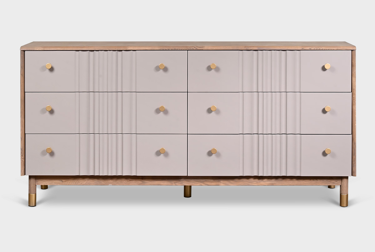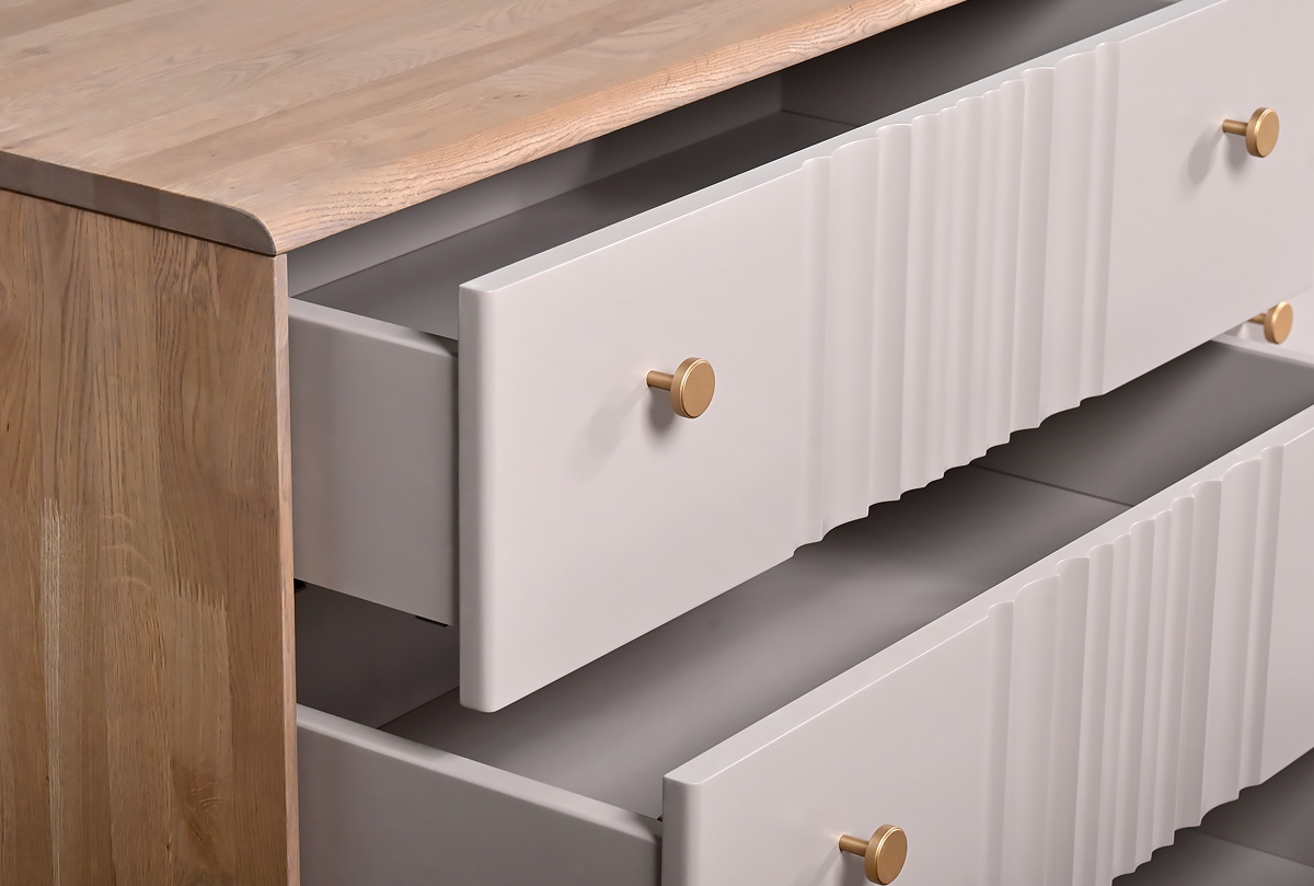 В коллекции «Меридиан» каждый предмет словно создан художником — она наполнена ритмом, изяществом и утонченностью. Волнообразные фасады будто переносят текстуру мягкой ткани на древесную плоскость, создавая игру света и тени. Высокие ножки придают легкость, а минималистичная позолоченная фурнитура добавляет изысканный штрих.