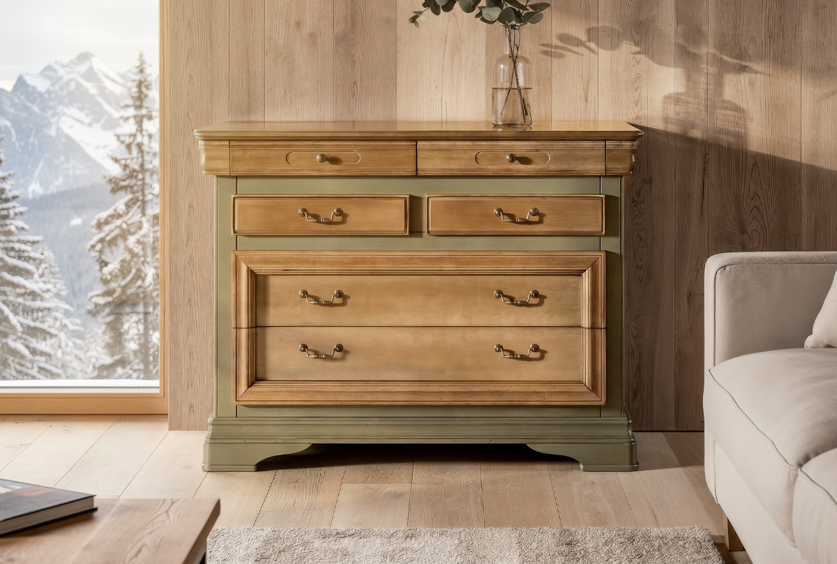 ✅ Комод изготовлен из массива и шпона ольхи.