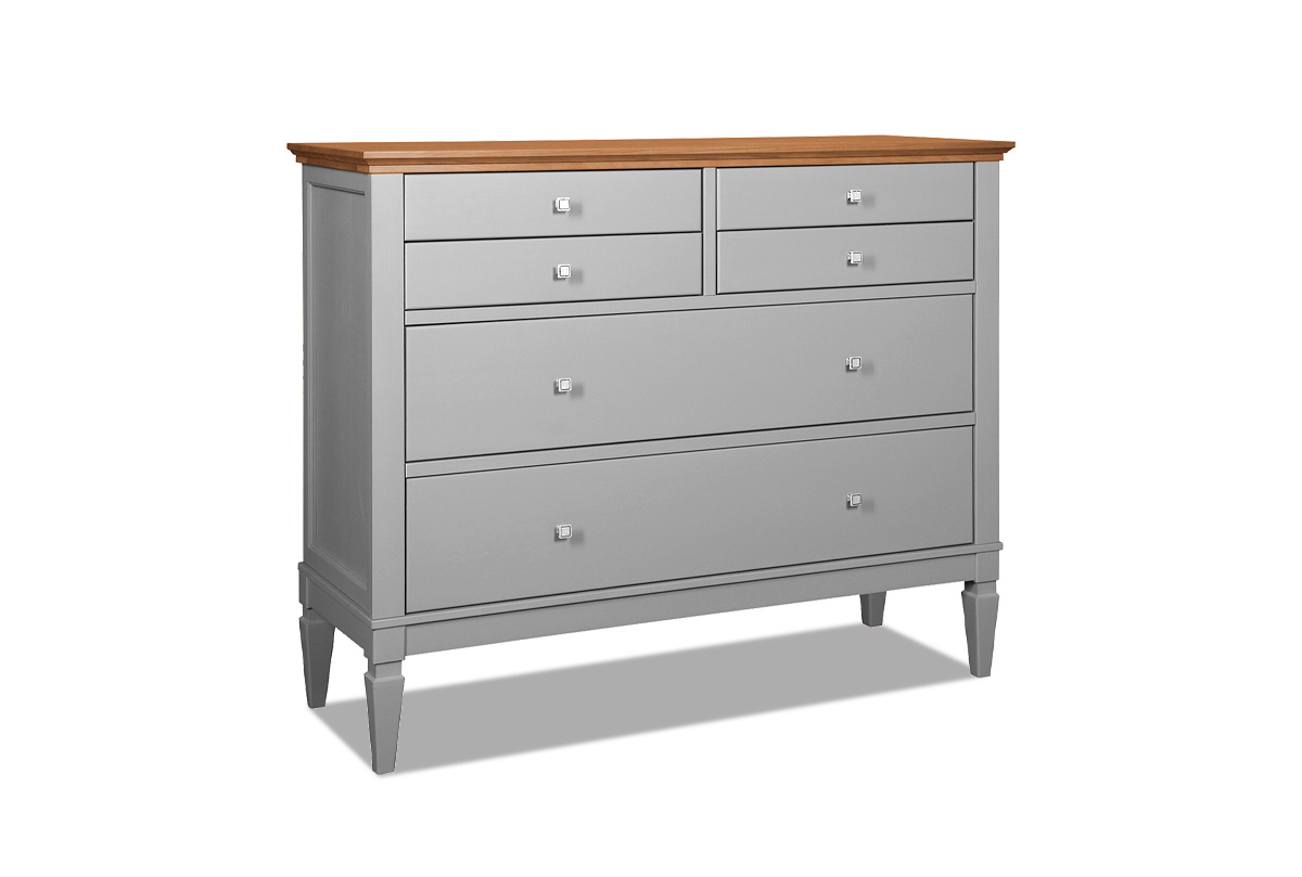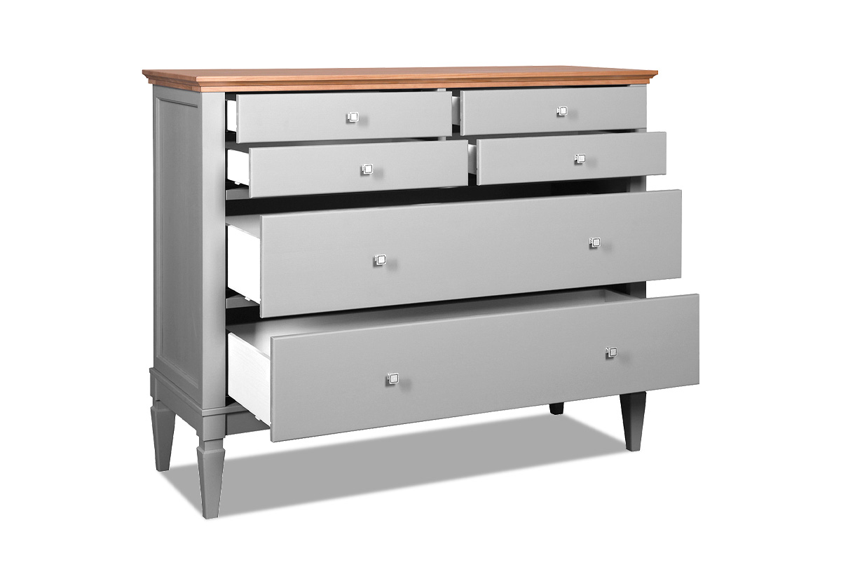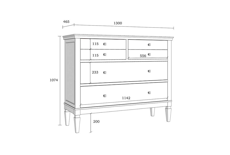 Комод «Ольса» 042. Размеры (ШxВxГ) 1300 x 1074 x 465 мм. Комод оснащен двумя большими и четырьмя маленькими ящиками. Фурнитура на ящиках с доводчиками. Высокие ножки обеспечивают оптимальный доступ при уборке.
