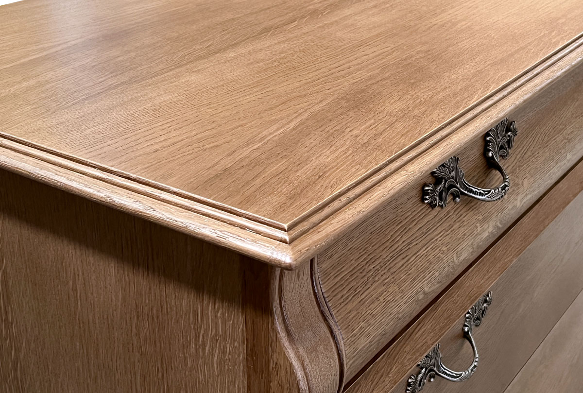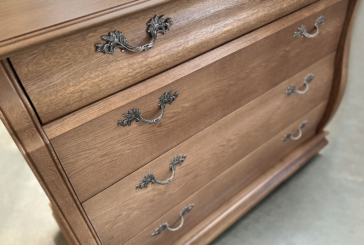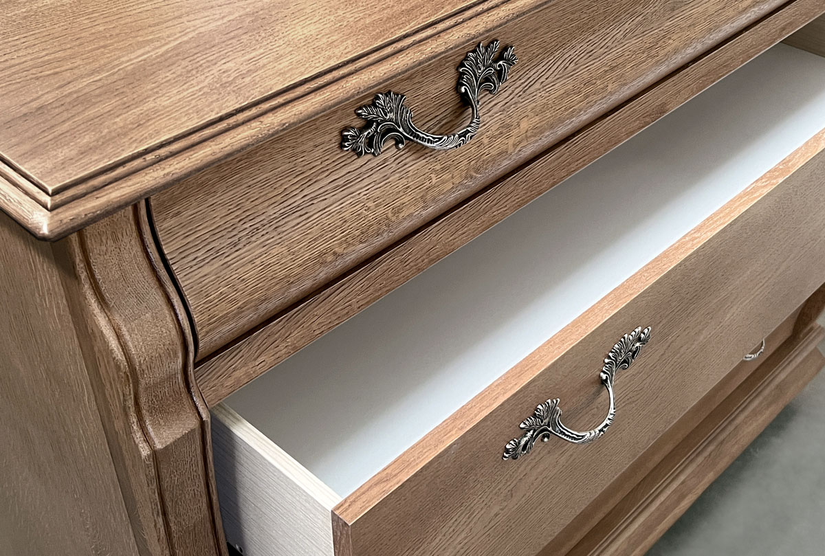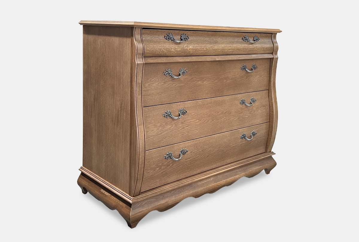 Обладающий неповторимым стилем, оформленный под старину комод для спальни «Оскар» в цвете «классик» обращает на себя внимание при входе в комнату. Внешне конструкция комода довольно проста, при этом строгие линии столешницы, фигурный цоколь и отливающие серебром и золотом элементы фурнитуры делают этот предмет поистине произведением мебельных мастеров. Комод изготовлен из массива и шпона дуба, а внутренняя поверхность верхнего ящика выполнена в бархатном велюре.