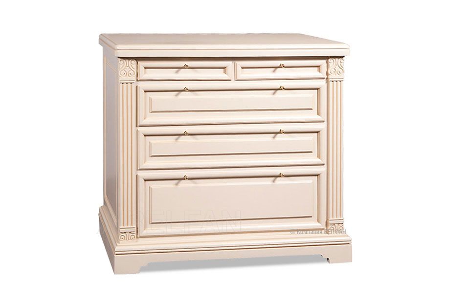 Строгий комод, обладающий классическими чертами, обязательно привлечет ваш интерес, прекрасно дополнив спальню коллекции "Престиж". Он вместительный и функциональный: в верхней части разделен на два ящика, а в нижней – оснащен одним объемным ящиком. Фронтальная панель изделия стилизована под старинную мебель прошлых веков: фактурные окантовки и колониальные опоры тонированы оттенком "мокко".