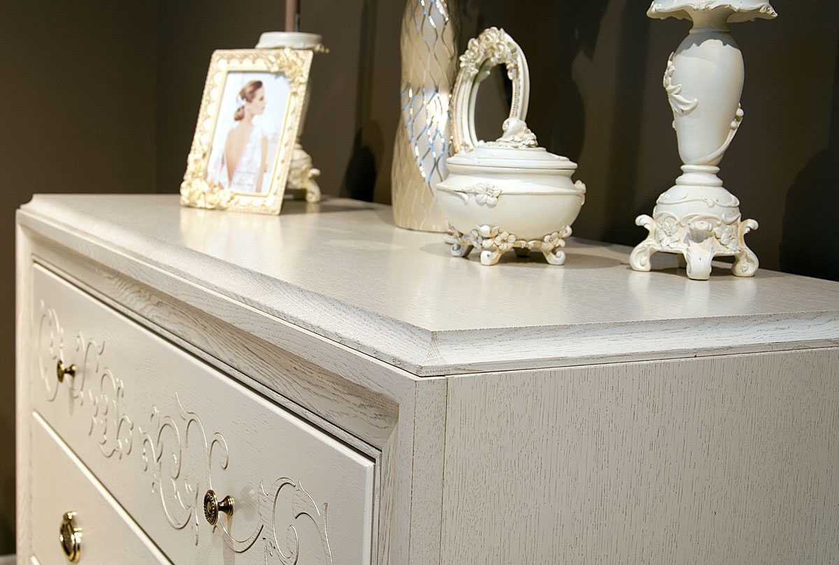 Массивный комод «Соната» в цвете «белая эмаль с темной патиной» сочетает в себе все то, что так нравится любителям итальянского стиля. Несомненная роскошь, благородные оттенки и изящная резьба – все это воплотилось в комоде Sonata. Оригинальная «винтажная» фурнитура перенесет Вас в Италию времен Возрождения, а традиционный дизайн комода напомнит о крепких семейных узах итальянцев. На высшем уровне не только красота, но и функциональность: три глубоких выдвижных ящика без проблем вместят постельное белье даже большой семьи. Согласитесь, такую мебель хочется передавать из поколения в поколение, и, может быть, этот комод действительно станет вашей семейной реликвией.