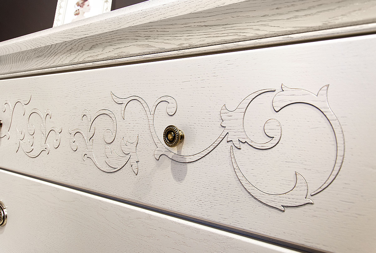 ✅ Изюминку дизайну комода придает оригинальный объемный рисунок в виде цветочного узора на фасаде ящика.