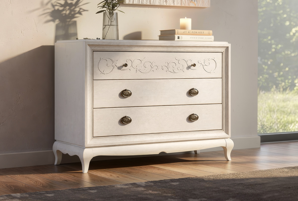 Массивный комод «Соната» в цвете «белая эмаль с темной патиной» сочетает в себе все то, что так нравится любителям итальянского стиля. Несомненная роскошь, благородные оттенки и изящная резьба – все это воплотилось в комоде Sonata. Оригинальная «винтажная» фурнитура перенесет Вас в Италию времен Возрождения, а традиционный дизайн комода напомнит о крепких семейных узах итальянцев. На высшем уровне не только красота, но и функциональность: три глубоких выдвижных ящика без проблем вместят постельное белье даже большой семьи. Согласитесь, такую мебель хочется передавать из поколения в поколение, и, может быть, этот комод действительно станет вашей семейной реликвией.
