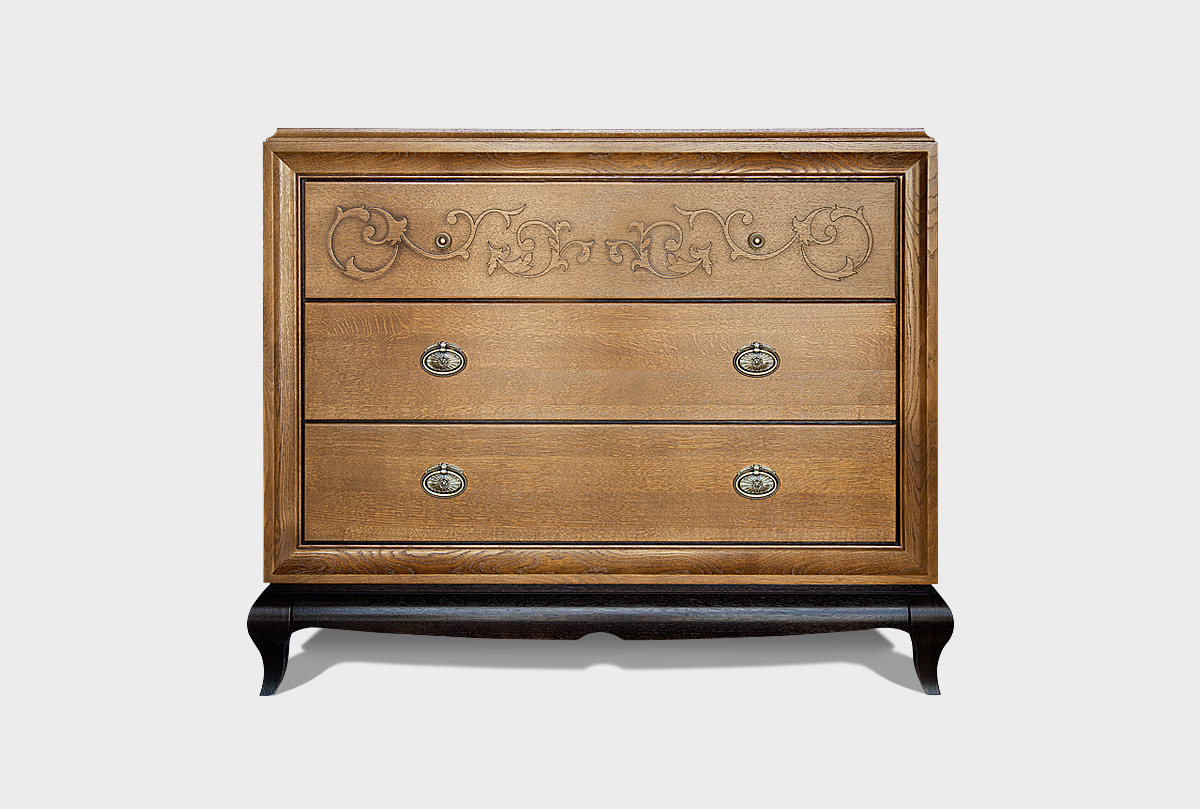 Массивный комод «Соната» в цвете «коньяк с тёмной патиной+горький шоколад» сочетает в себе все то, что так нравится любителям итальянского стиля. Несомненная роскошь, благородные оттенки и изящная резьба – все это воплотилось в комоде Sonata. Оригинальная «винтажная» фурнитура перенесет Вас в Италию времен Возрождения, а традиционный дизайн комода напомнит о крепких семейных узах итальянцев. На высшем уровне не только красота, но и функциональность: три глубоких выдвижных ящика без проблем вместят постельное белье даже большой семьи. Согласитесь, такую мебель хочется передавать из поколения в поколение, и, может быть, этот комод действительно станет вашей семейной реликвией.