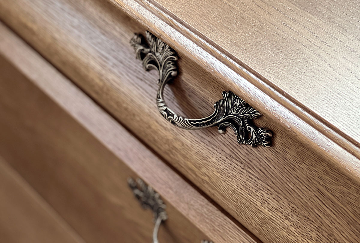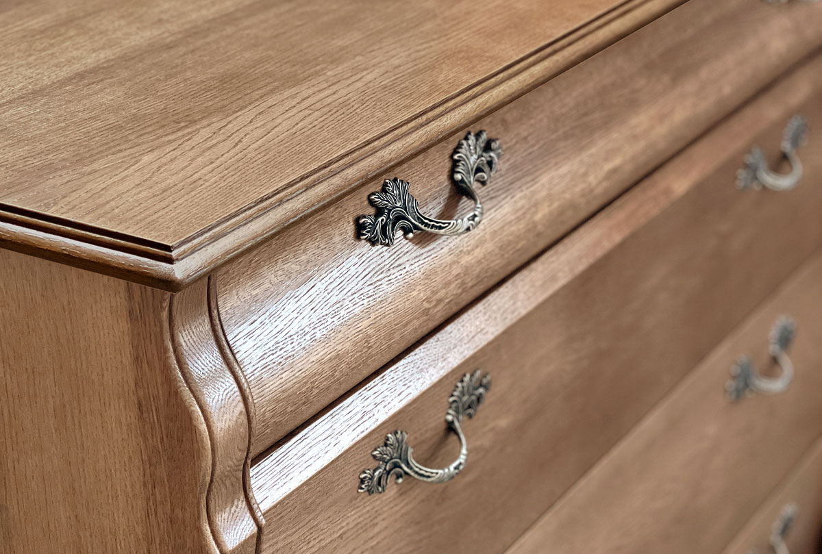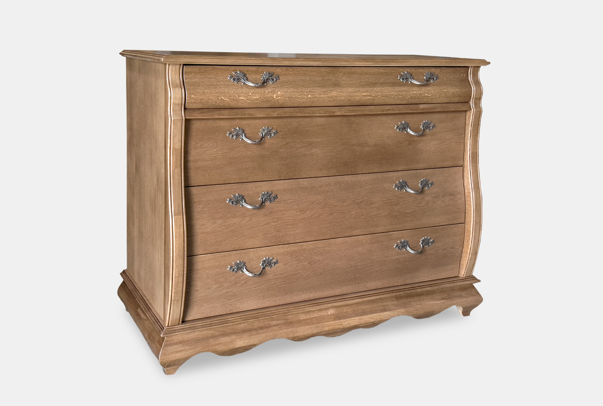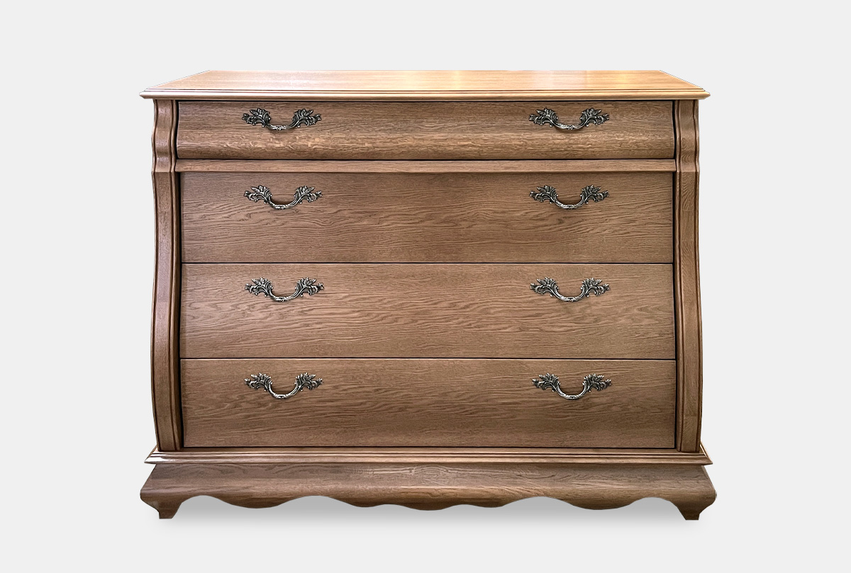 Обладающий неповторимым стилем, оформленный под старину комод для спальни «Тэфи» в цвете «классик» обращает на себя внимание при входе в комнату. Внешне конструкция комода довольно проста, при этом строгие линии столешницы, фигурный цоколь и отливающие серебром и золотом элементы фурнитуры делают этот предмет поистине произведением мебельных мастеров. Комод изготовлен из массива и шпона дуба, а внутренняя поверхность верхнего ящика выполнена в бархатном велюре.