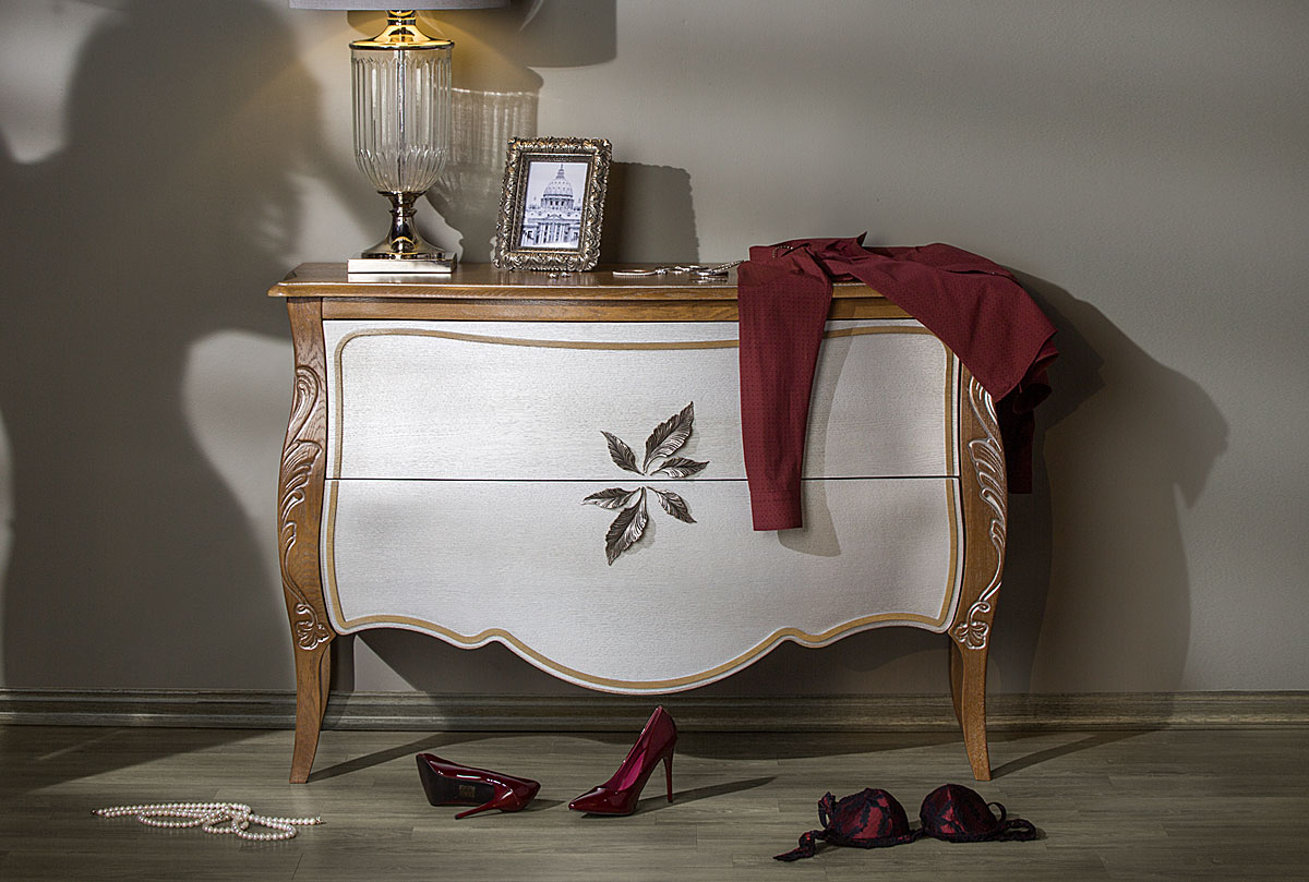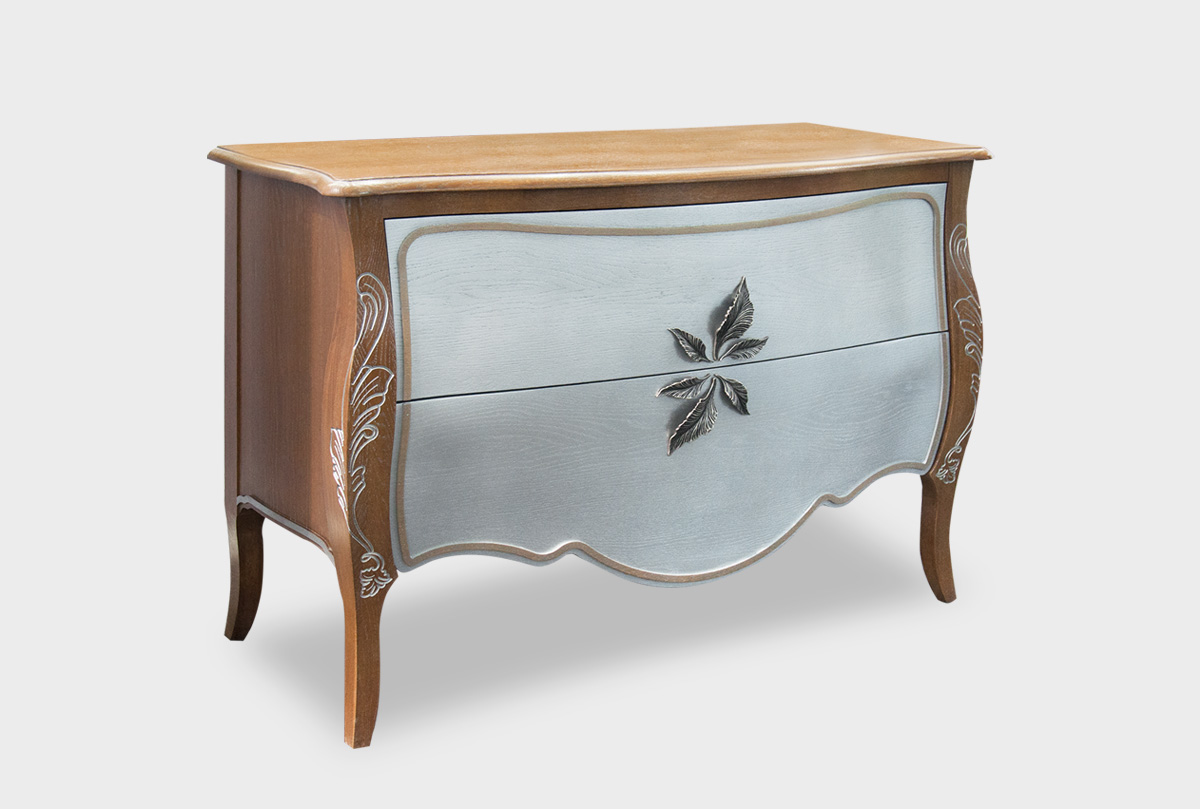Поистине роскошный комод из коллекции «Трио» в цвете «коньяк с серебряной патиной+серебро» - прекрасный подарок себе и своим близким. Изготовленный из массива и шпона дуба, декорированный резьбой, он станет украшением любого интерьера и будет приковывать к себе взгляды всех Ваших гостей. Объемные 3D фасады и фурнитура в виде лепестков, фигурные ножки и велюровое дно ящиков позволит Вам почувствовать себя в своей квартире королевской особой. Функционал также на высоком уровне: два вместительных выдвижных ящика станут отличным местом хранения постельного белья и личных вещей. Доводчики, которыми оснащены ящики, позволят закрывать их бесшумно: согласитесь, для спальни это очень важно.