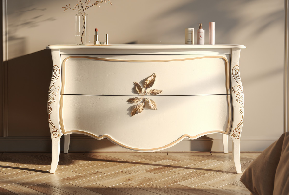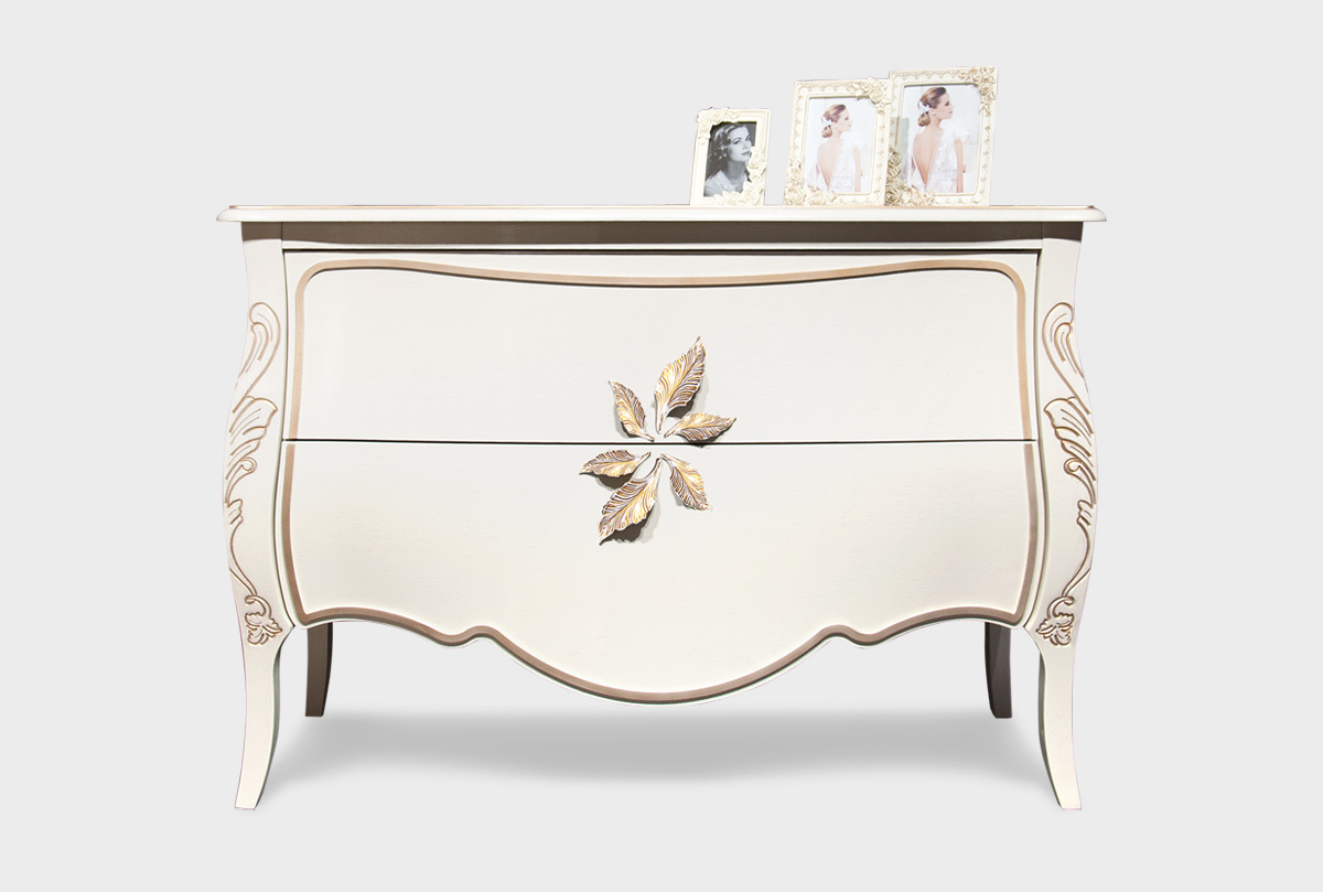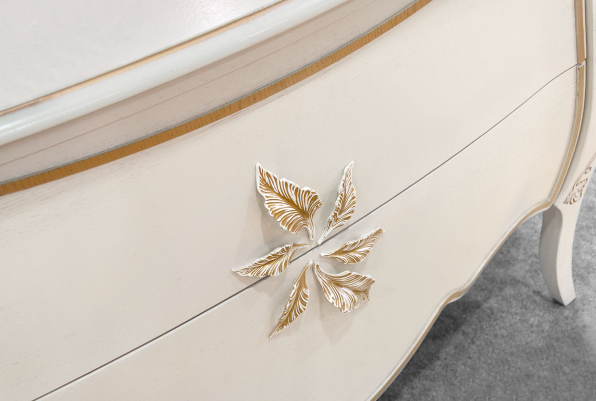 Поистине роскошный комод из коллекции «Трио» в цвете «белая эмаль с золотой патиной» - прекрасный подарок себе и своим близким. Изготовленный из массива и шпона дуба, декорированный резьбой, он станет украшением любого интерьера и будет приковывать к себе взгляды всех Ваших гостей. Объемные 3D фасады и фурнитура в виде лепестков, фигурные ножки и велюровое дно ящиков позволит Вам почувствовать себя в своей квартире королевской особой. Функционал также на высоком уровне: два вместительных выдвижных ящика станут отличным местом хранения постельного белья и личных вещей. Доводчики, которыми оснащены ящики, позволят закрывать их бесшумно: согласитесь, для спальни это очень важно.