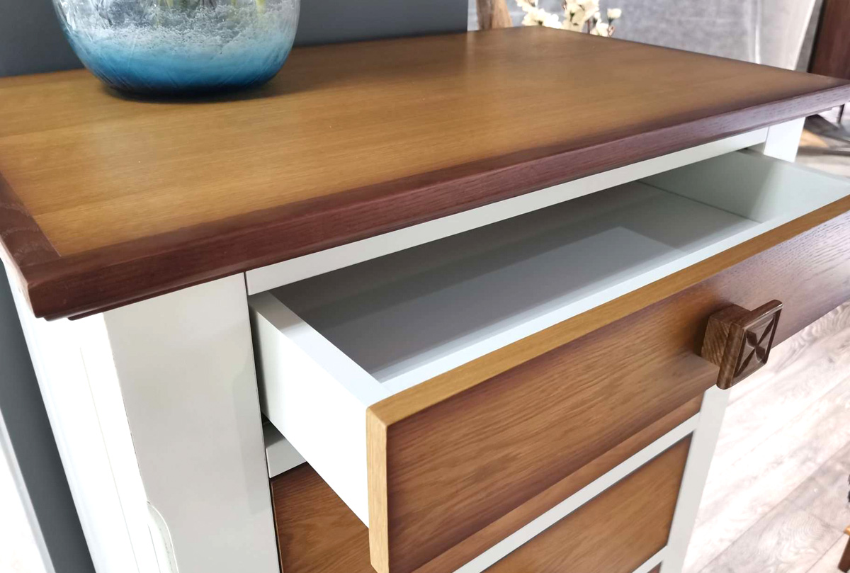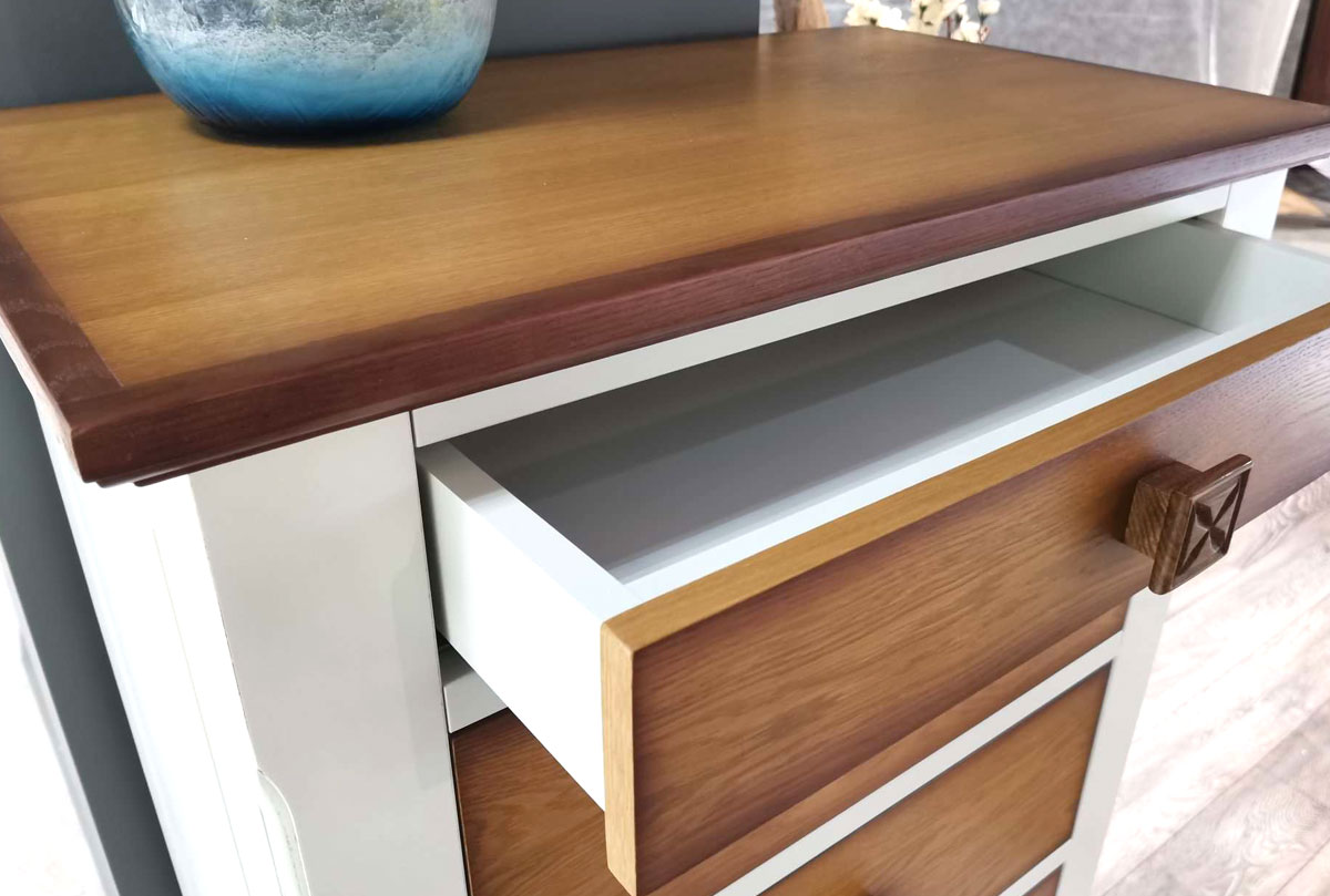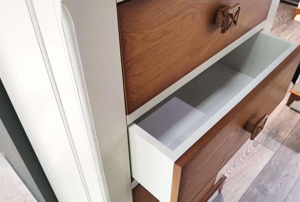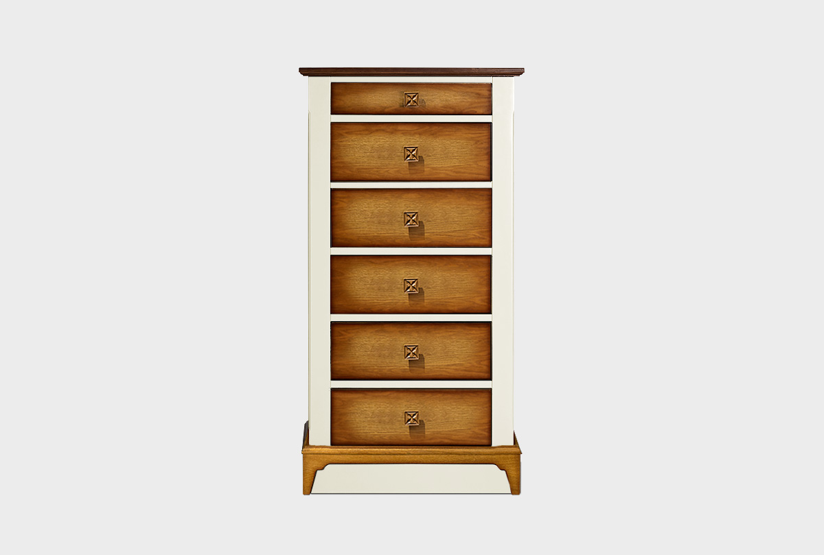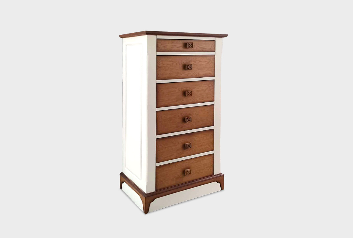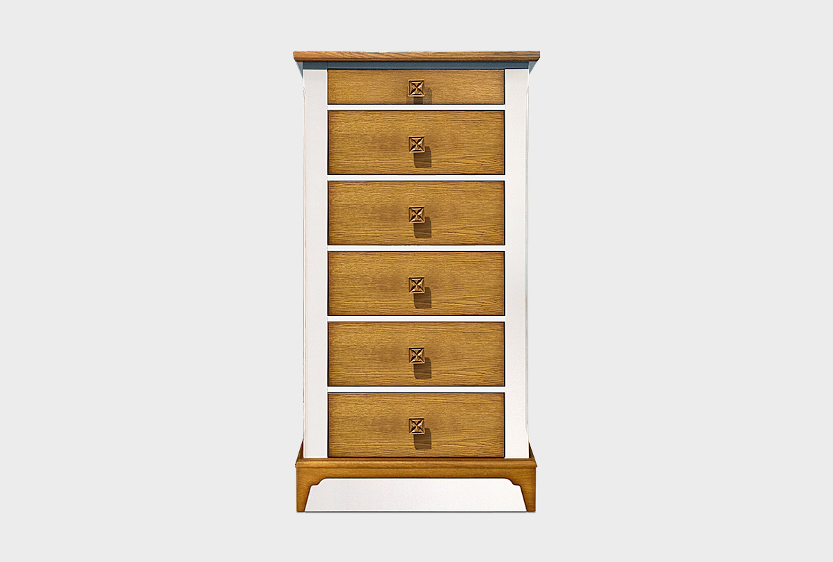 Комод высокий Brianson из массива и шпона дуба, в цвете "жемчуг+дуб" с шестью выдвижными ящиками. Мебель для спальни «Бриансон» из дуба в стиле Прованс. Размеры изделия: 753 х 1427 х 450 мм.