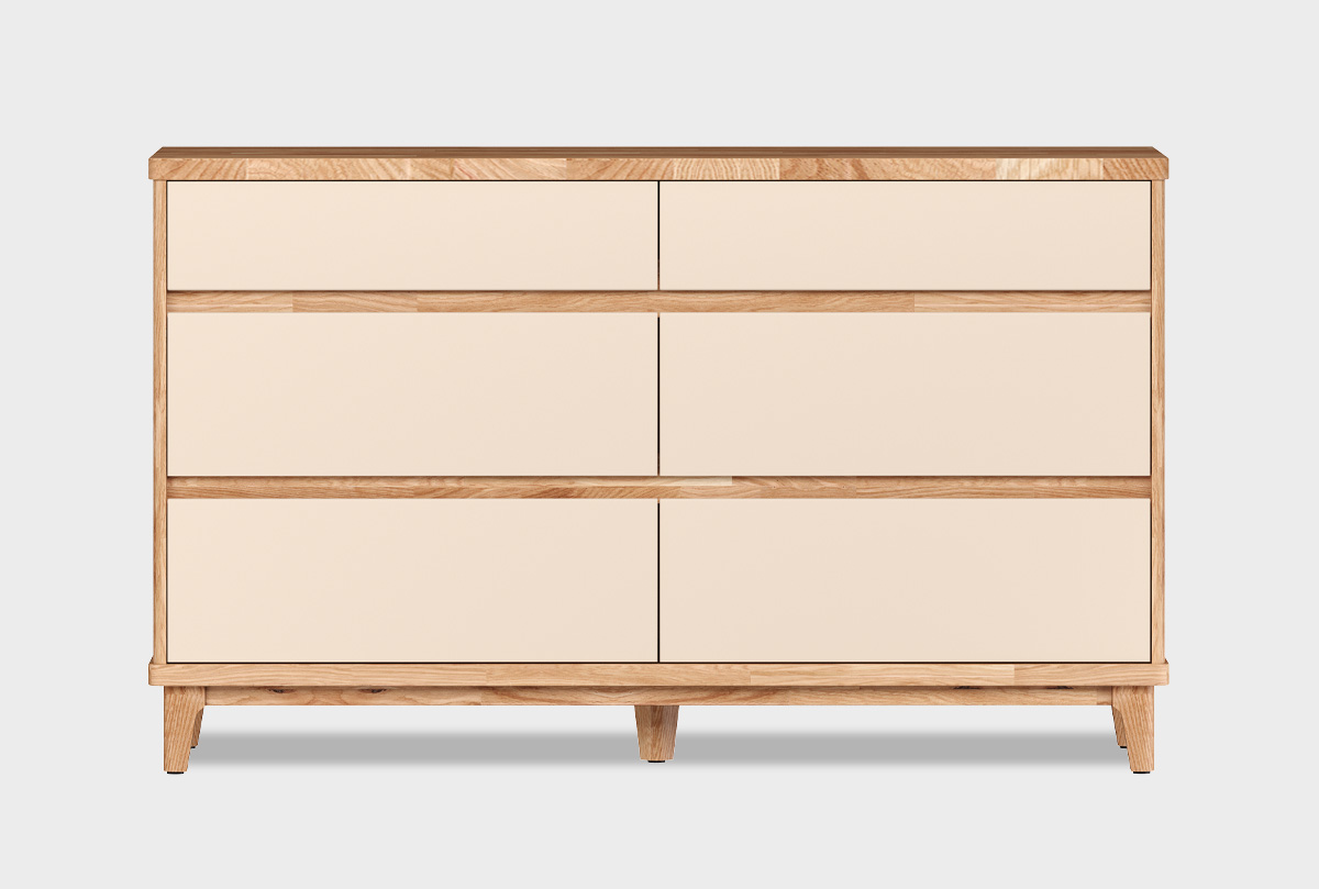 Широкий комод Wallstreet в цвете «к-бейц-масло, ф-нюд, вст-бейц-масло» для спальни из натурального дуба.