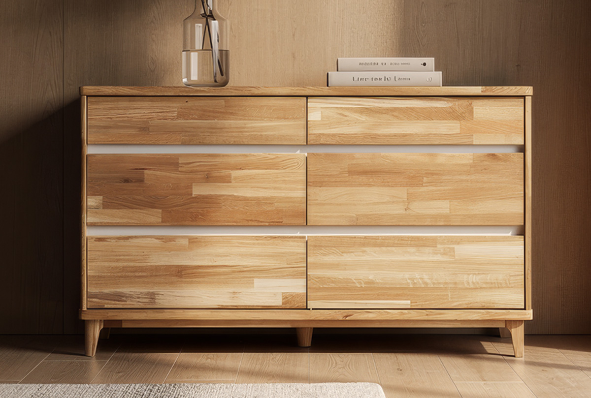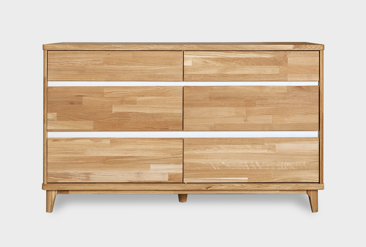 Широкий комод Wallstreet в цвете «к-бейц-масло, ф-бейц-масло, вст-белый» для спальни из натурального дуба.