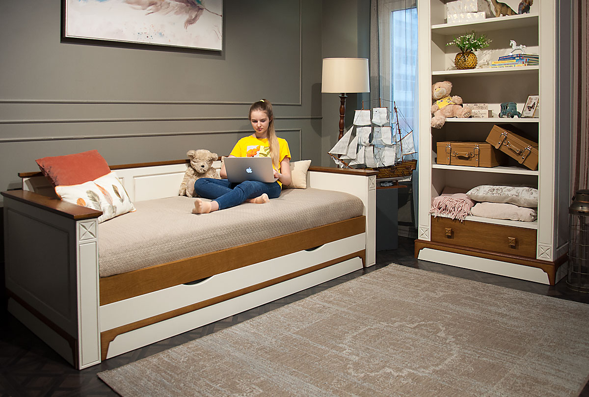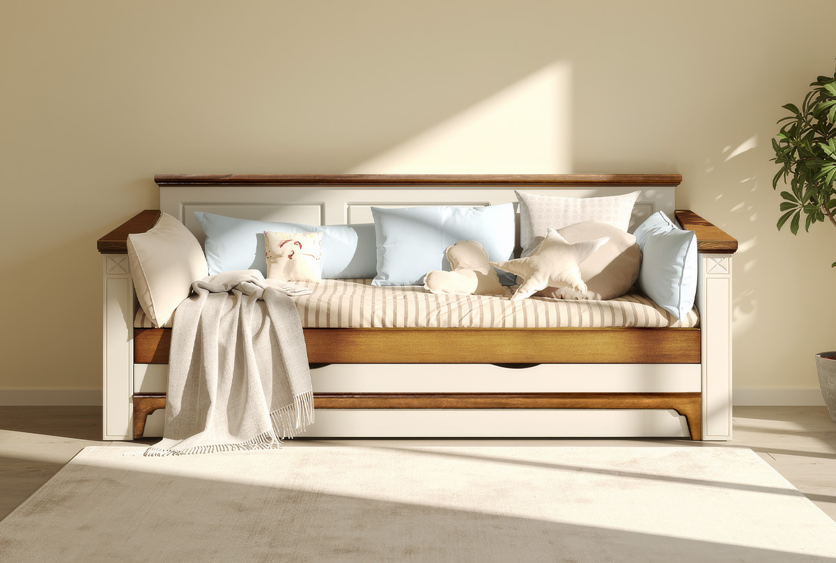 Кровать-диван «Бриансон» в цвете "жемчуг+дуб" прекрасно подходит для детских и гостевых комнат. Добротная и стильная кровать из массива и шпона дуба, станет незаменима в Вашем доме и сэкономит место. Днем – это компактный диван, а ночью 2 полноценных спальных места.