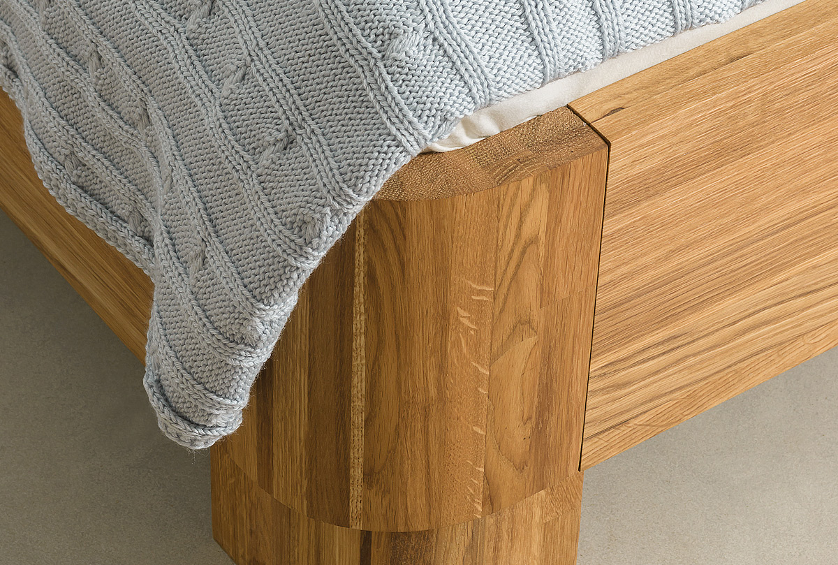✅ Несмотря на минималистичный дизайн, царги кровати изготавливаются из утолщенного массива, искусно подобранного по цвету и фактуре благородного дуба, что создает не только безупречный вид, но и долговечность.