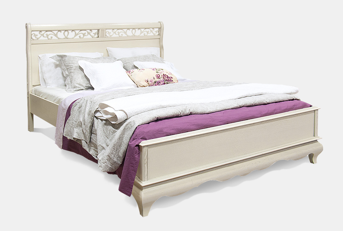 Кровать «Оскар» (1400x2000) с низким изножьем в цвете «белая эмаль с темной патиной» из массива дуба поражает воображение ясными пропорциями и утонченным изяществом резной спинки.