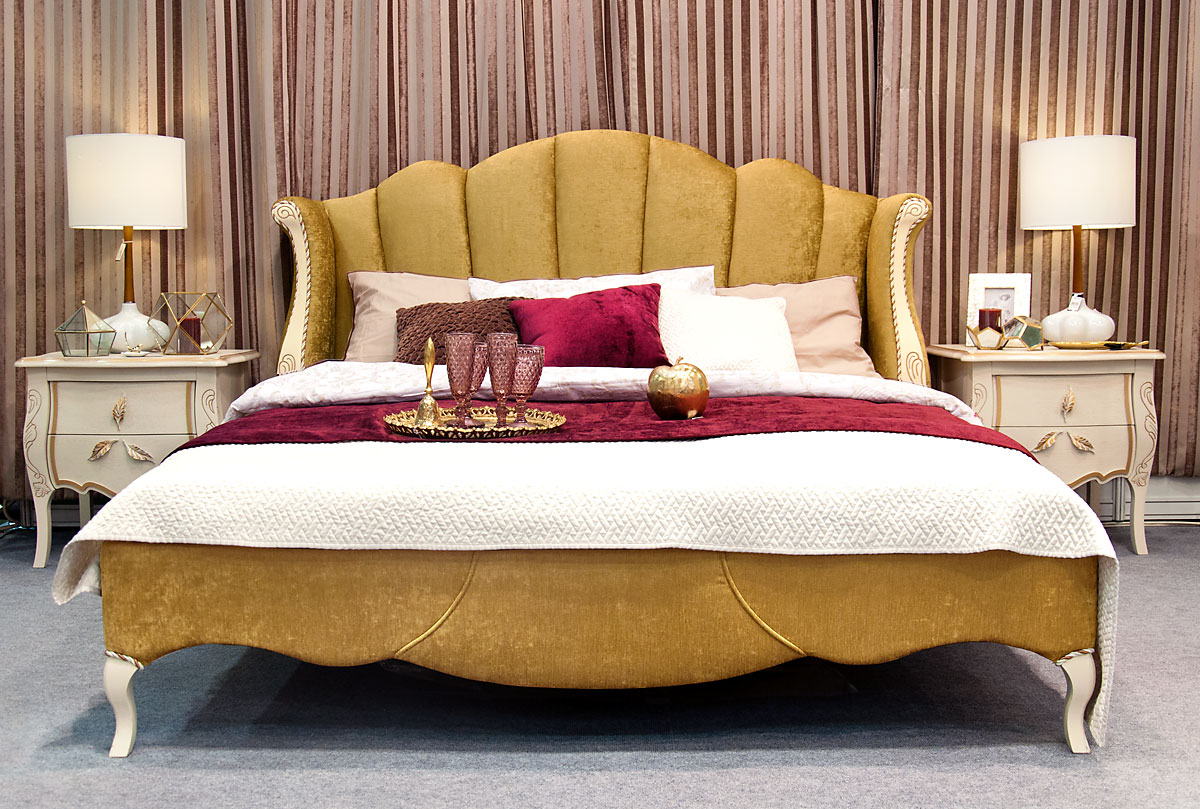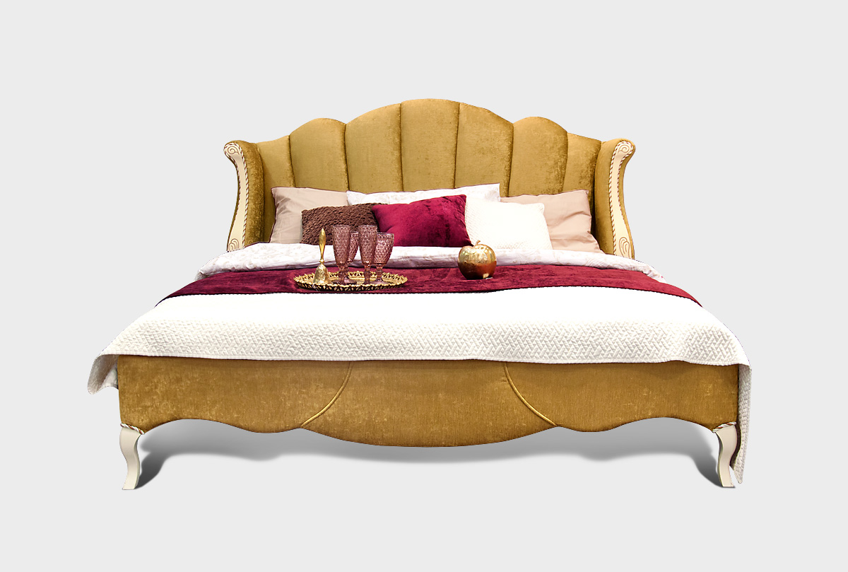 Кровать с цветом корпуса "белая эмаль с золотой патиной" с мягким изголовьем (основание обито тканью И-25) «Трио» (Trio). Спальное место 1600x2000 мм.