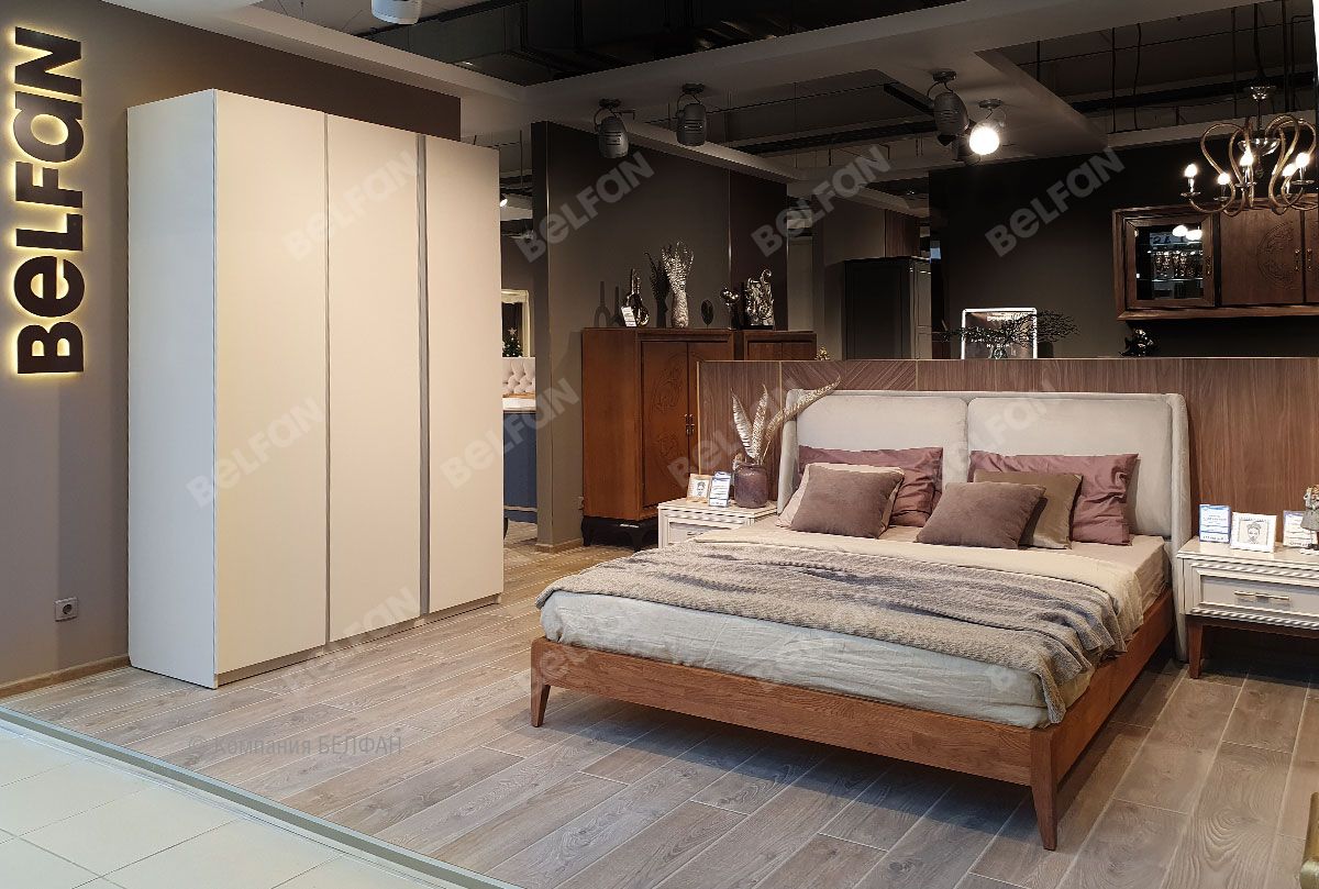 Кровать "Сакраменто" (мягкое изголовье), орех, Tiffany 2 Beige, без основания, без матраса, (.Г000071705)