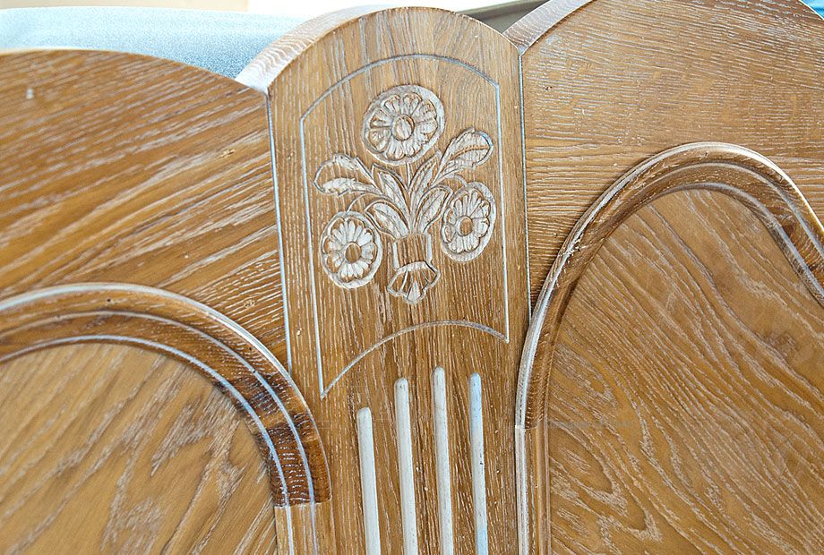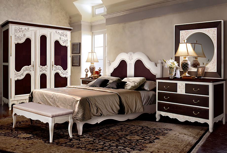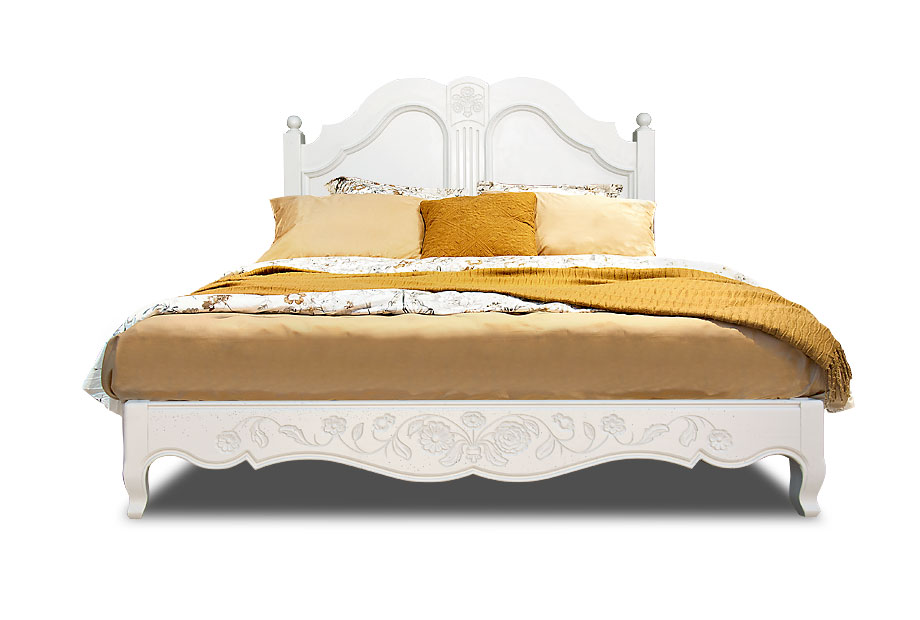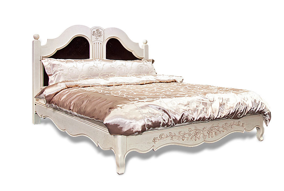 - Ручная резьба на изголовье и изножье кровати, фрезеровка по нижнему краю «юбки», фигурная рамка и филенка изголовья придают изделию утонченность и благородство.