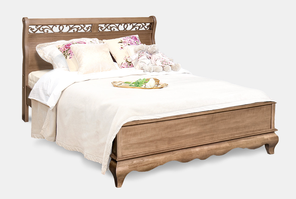 Двуспальная кровать «Тэфи» (1600x2000) с низким изножьем в цвете «классик» из массива дуба поражает воображение ясными пропорциями и утонченным изяществом резной спинки.