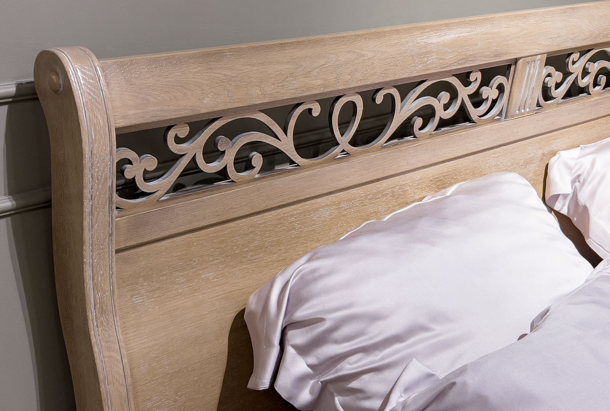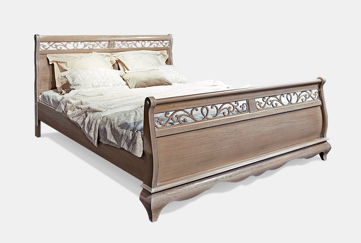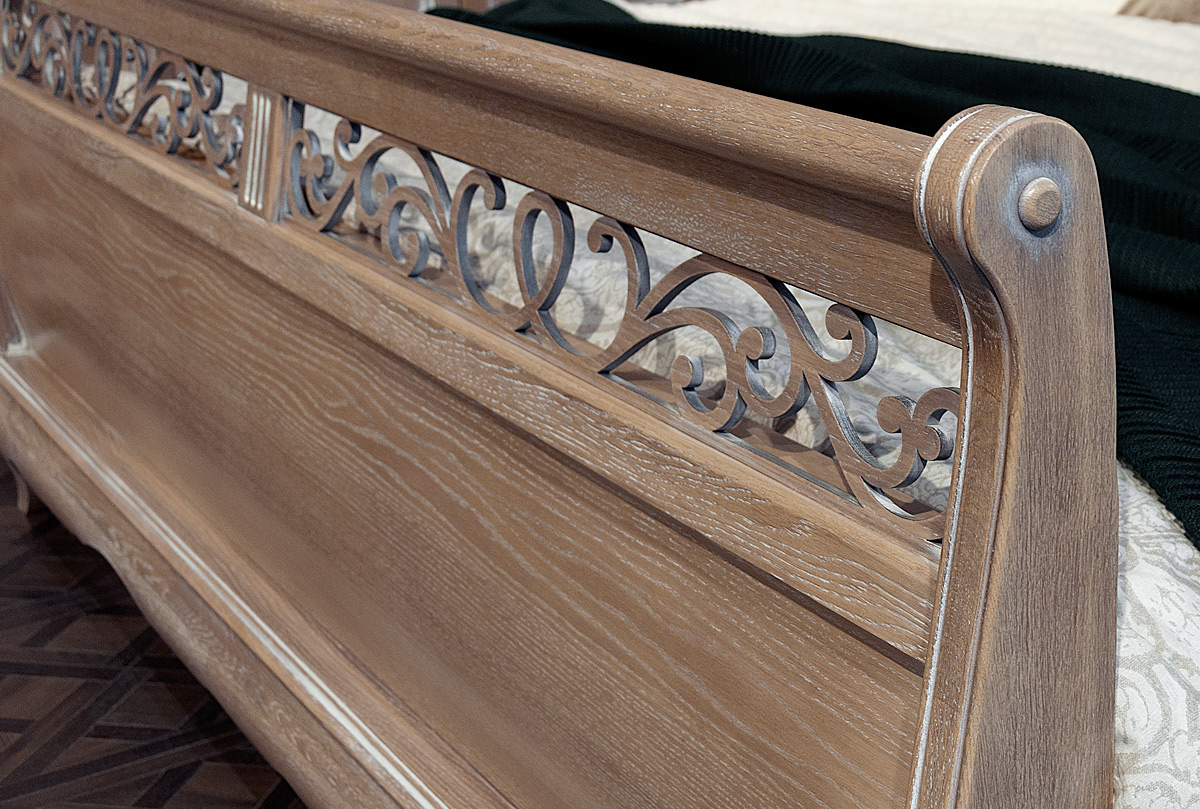 Кровать «Тэфи» (Tefi) с высоким изножьем (1600х2000 спальное место) в цвете «амбэр с белой патиной» из массива дуба поражает воображение ясными пропорциями и утонченным изяществом резной спинки. Двуспальная кровать подходит для спальни.