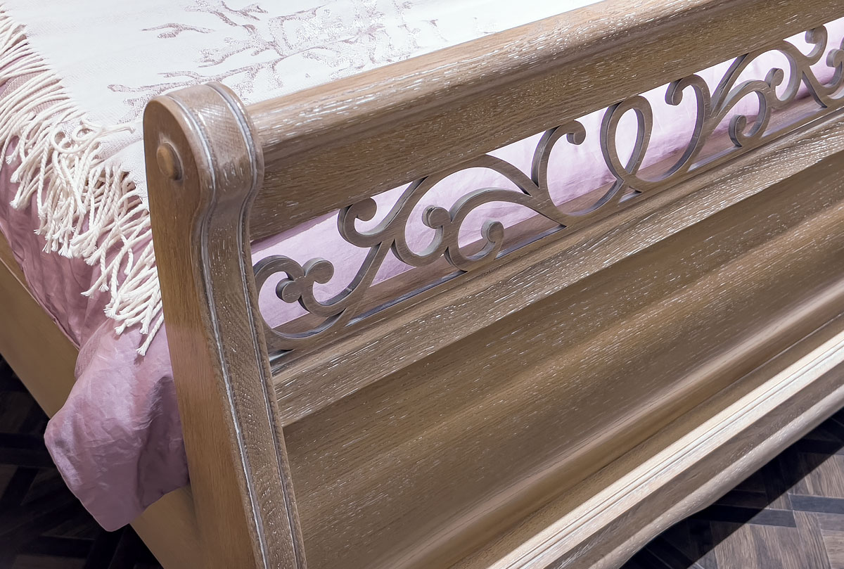 ✅ Гнутое изголовье с ажурной резьбой в верхней части.