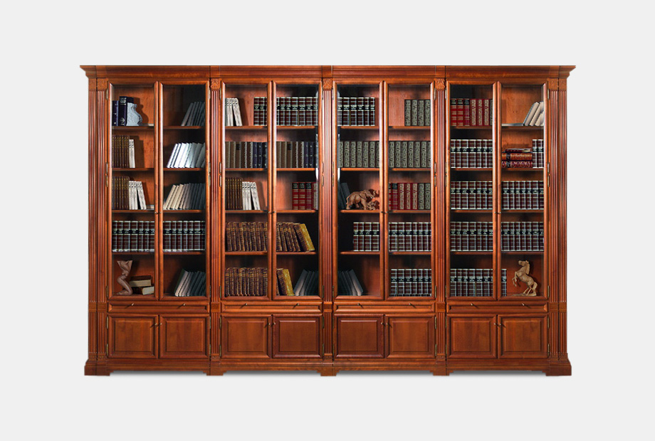 Набор мебели для библиотеки из коллекции "Престиж" 17.4 участвует в создании классического пространства, в котором царит атмосфера уюта и безмятежности. Изготовленный из массива и шпона берёзы, набор из четырех секций отличается богатой текстурой дерева и благородным, сдержанными цветом. Карниз и пилястры украшены резными элементами, в центре набора размещаются выдвижные ящики. За большими стеклянными дверцами можно разместить все ценное для души хозяина – интересные книги, памятные вещицы и любимые фотографии.
