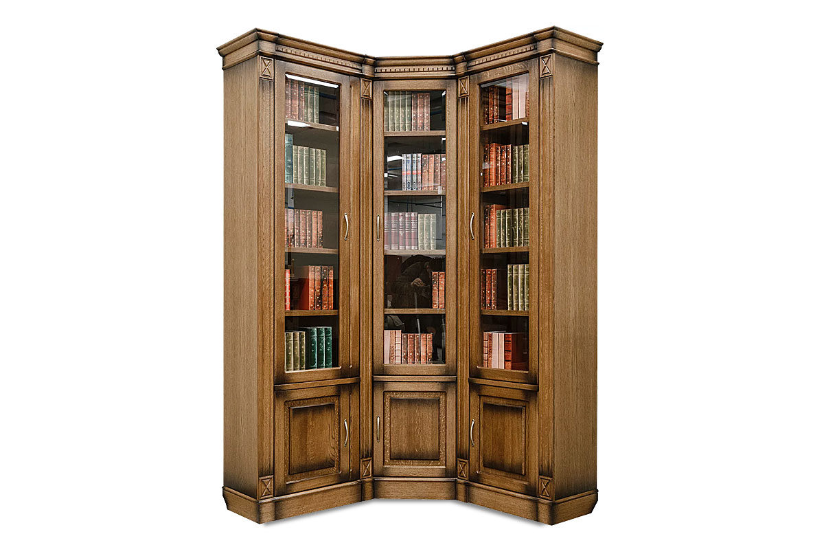 Угловой набор мебели для библиотеки «Верди Люкс 1» обязательно понравится тем, кто не мыслит своей жизни без книг. Благодаря тому, что верхняя секция оснащена стеклянными дверками, Вы сможете без труда найти нужное издание. Полки, регулируемые по высоте, без труда поместят всю семейную библиотеку. Фигурный цоколь и резные пилястры дополняют образ изделия, делая его законченным.