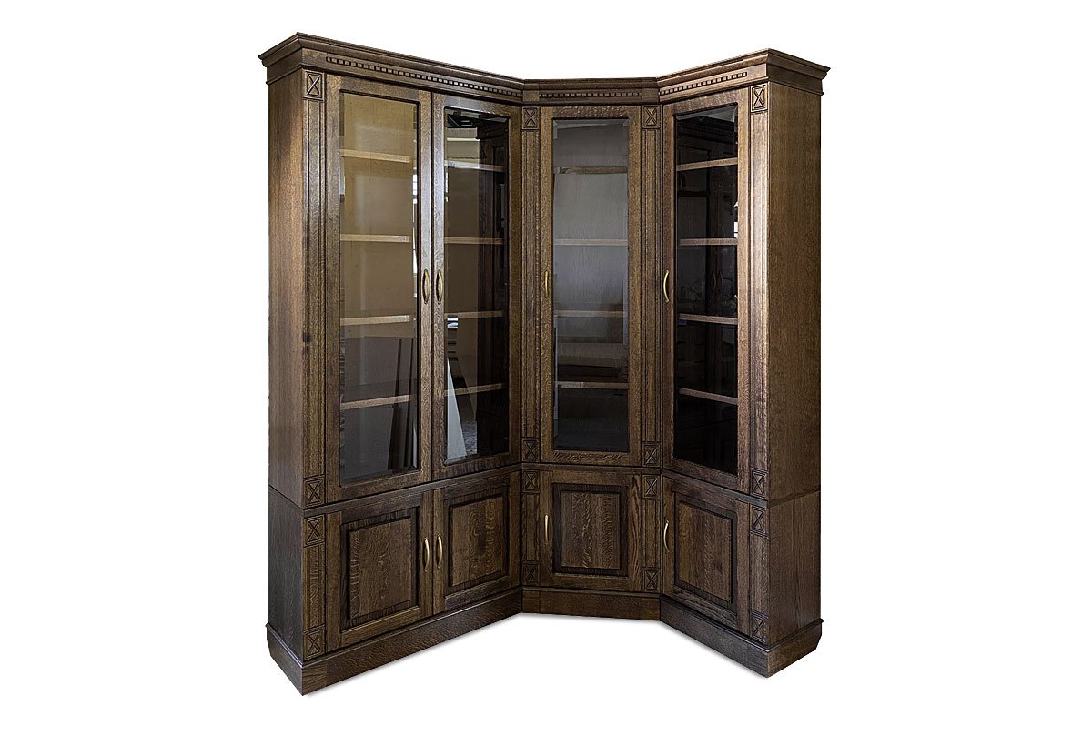 Угловой шкаф для библиотеки «Верди Люкс 2» обязательно понравится тем, кто не мыслит своей жизни без книг. Благодаря тому, что верхняя секция оснащена стеклянными дверками, Вы сможете без труда найти нужное издание. Полки, регулируемые по высоте, без труда поместят всю семейную библиотеку. Фигурный цоколь и резные пилястры дополняют образ изделия, делая его законченным.
