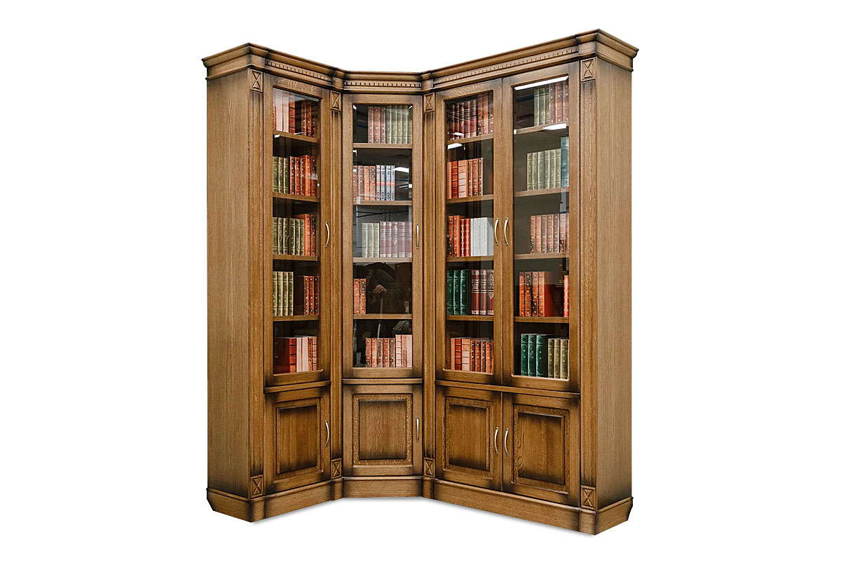 Угловой шкаф для библиотеки «Верди Люкс 2» обязательно понравится тем, кто не мыслит своей жизни без книг. Благодаря тому, что верхняя секция оснащена стеклянными дверками, Вы сможете без труда найти нужное издание. Полки, регулируемые по высоте, без труда поместят всю семейную библиотеку. Фигурный цоколь и резные пилястры дополняют образ изделия, делая его законченным.