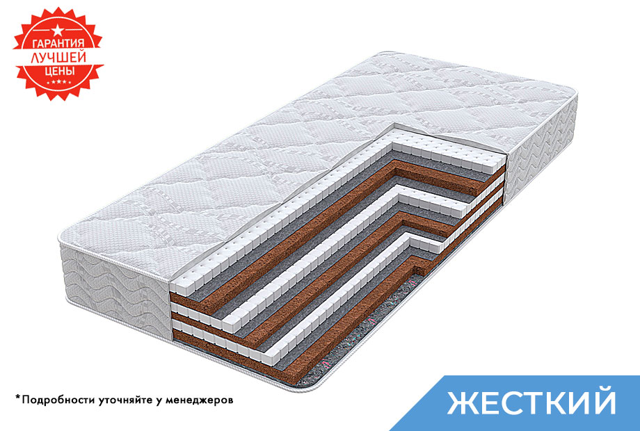 Матрас с разной жесткостью сторон из лучших натуральных наполнителей, которые одновременно являются и основой, и комфортными слоями. С одной стороны кокосовая койра придает поверхности высокую жесткость, с другой — натуральный латекс создает универсальную среднюю. Оптимальный для сна микроклимат поддерживается благодаря хорошей воздухопроницаемости наполнителей. Для повышения износостойкости слои чередуются с термовойлоком, прочным изоляционным материалом, который препятствует трению. Чехол выполнен из приятной на ощупь трикотажной ткани, простеганной на объемном волокне.