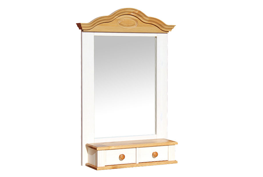 Полка-зеркало «Синди» (Sindy) из массива сосны. Состоит из зеркального полотна, вставленного в раму. Так же имеются 2 небольших ящика под хранение мелких предметов. Оснащено приспособлениями для вывешивания на стене.